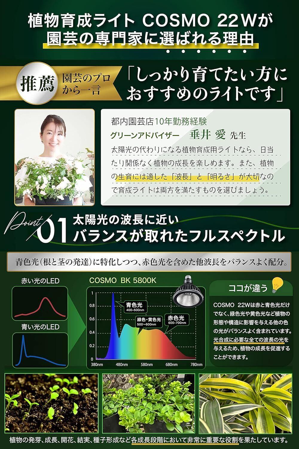 【太陽光に近い波長で美しく育つ】 自然光である太陽光に含まれる7色の可視光を連続的にバランスよく発光させます。赤波長は光合成効率に優れており植物の成長を促します。青波長には植物の葉、茎を丈夫に育てる役割があります。さらに赤と青色光だけでなく、緑色光や黄色光など植物の形態や構造に影響を与える他の色の光がバランスよく含まれており光合成に必要な全ての波長の光を与えるため、 植物の成長を促進することができるハイパフォーマンスな育成ライトです。