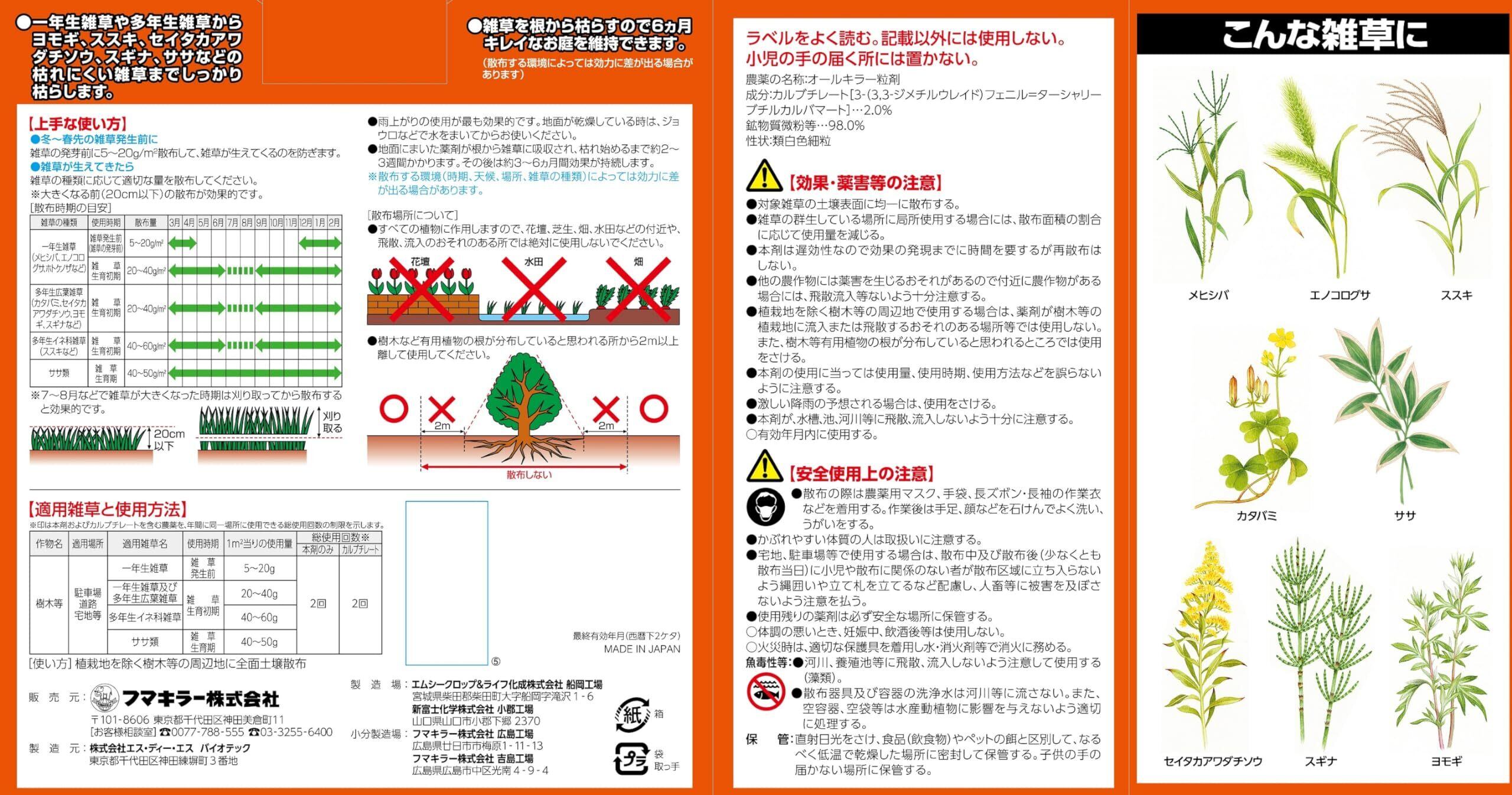 雑草の発生する場所に均等に散布してください。特に雑草の発生が激しい場所では、散布量を多めにしてください。