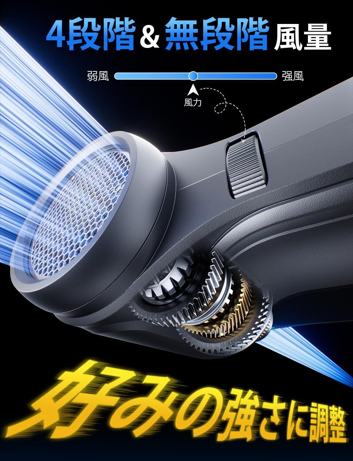 ️【無段階風量調整&4段階風速】このエアダスターは、2種類の風速調整ができる初の製品です!ワンタッチで風速4段階の切り替えモードがオンになります。3秒長押しすると、無級風速の調整モードがオンになります。2つのモードはそれぞれ優位性があります。