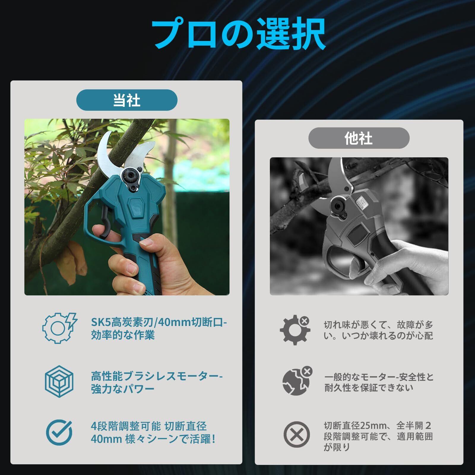 【ハイパワー&安全保護】切断サイズは4階段10mm、20mm、30mm、40mmがあり、直径40mmまでの樹木を傷つけずに簡単に切断できるパワーがあります。プルーナーにはブラシレスモーターを搭載し、ハイパワーを提供するとともに、過電流保護、過電流保護機能もを持っていて、より安定した性能とパワーを実現しました。