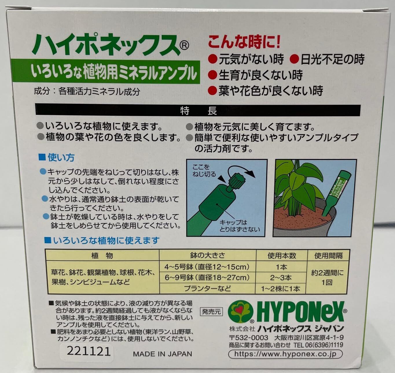 ●アンプルタイプの植物活力液です。●各種ミネラル成分を配合しています。●土に挿すだけで植物を元気に育てます。●植物の元気がないとき。●日光不足のとき。●生育がよくないとき。●花や葉色が良くないとき。