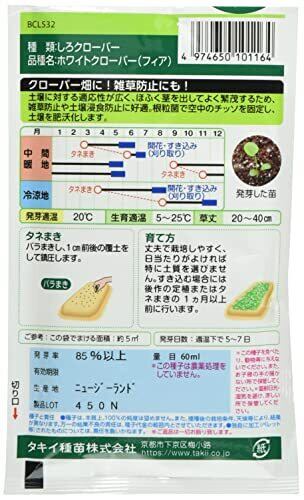 土づくりの強い味方。緑肥 ほふく性があり、よく繁殖するため雑草防止に。土壌改良にも好適! ●内容量:60ml ●発芽適温(度C):20 ●生育温度(度C):5~25 ●発芽日数:5~7日 ●有効期限:1年