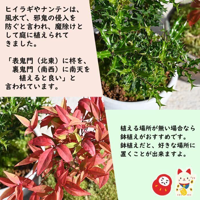 南天 柊盆栽 縁起の良い樹セット トゲトゲの葉が愛らしい姫ヒイラギ。 普通のヒイラギよりも葉が細かく、密に茂り、年間を通して美しい緑色を保ち特に新緑はとてもきれいです。 刈り込みに強く、低い生垣や花壇の縁取りにも適しています 葉が2~3センチ程度でとても小さく、姫ヒイラギと呼ばれています。 南天の読み方であるナンテンは難転(災難や難関を転じる)と当て字できるため、 昔から縁起の良い植物として人気でした。玄関や鬼門に花壇を作って植える庭木として昔から大切にされてきました。 秋の紅葉が美しく、冬になっても落葉しない性質をもちます。 縁起が良い木なので、大切な方への贈り物にもオススメです。 七福南天 高さ 15センチ前後 信楽鉢入り