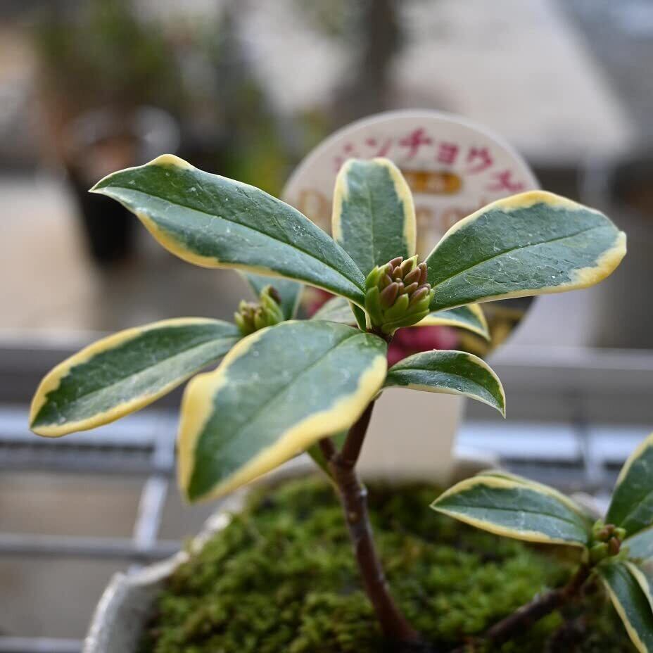 前島(黄深フクリン沈丁花)は、黄色がかった覆輪葉の珍しい斑入り葉沈丁花です。