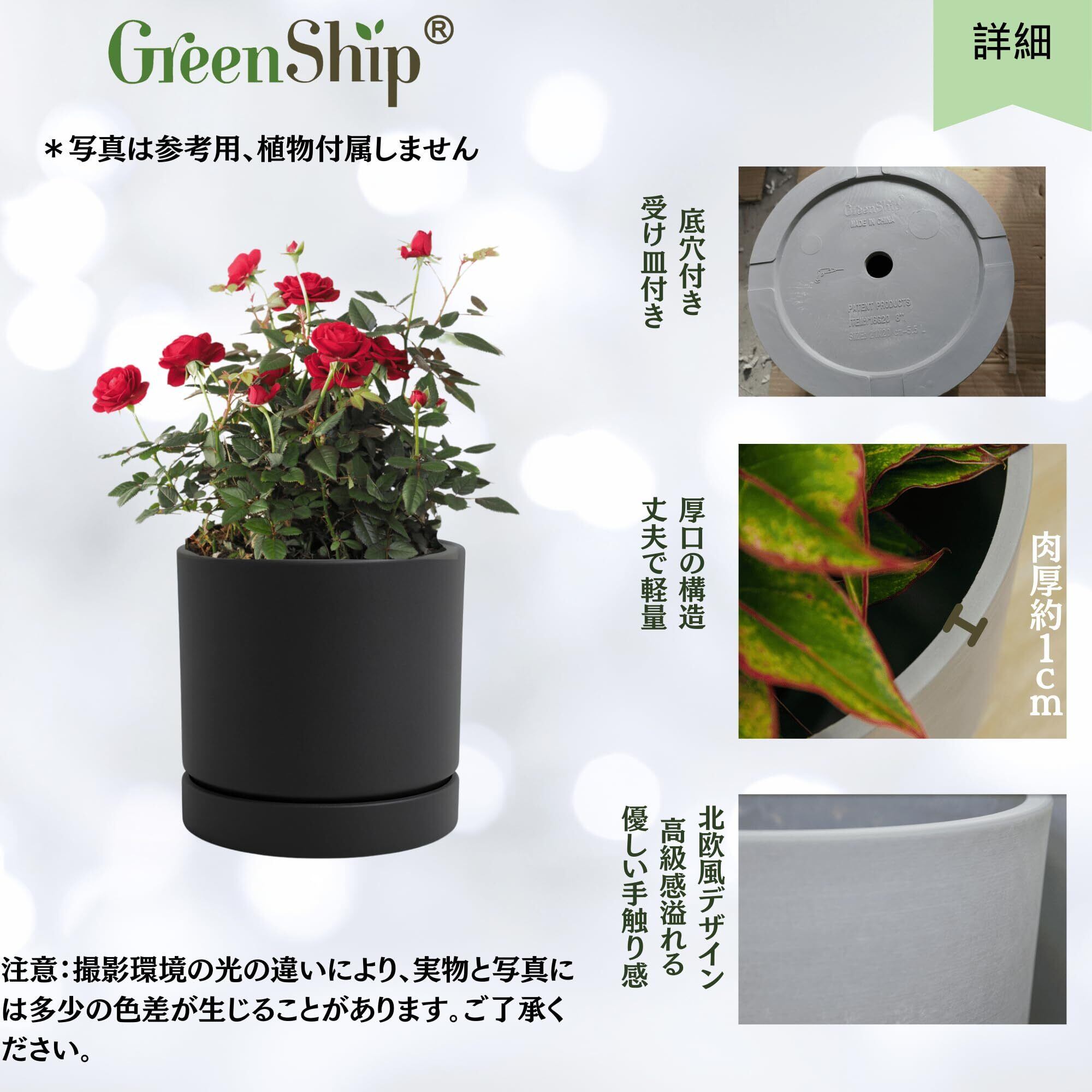 【数量限定】Greenship 植木鉢 受け皿付き 5号(15.8CM) マット質感なオシャレ鉢 エコ素材 白灰色 (ブラック, 5号)
