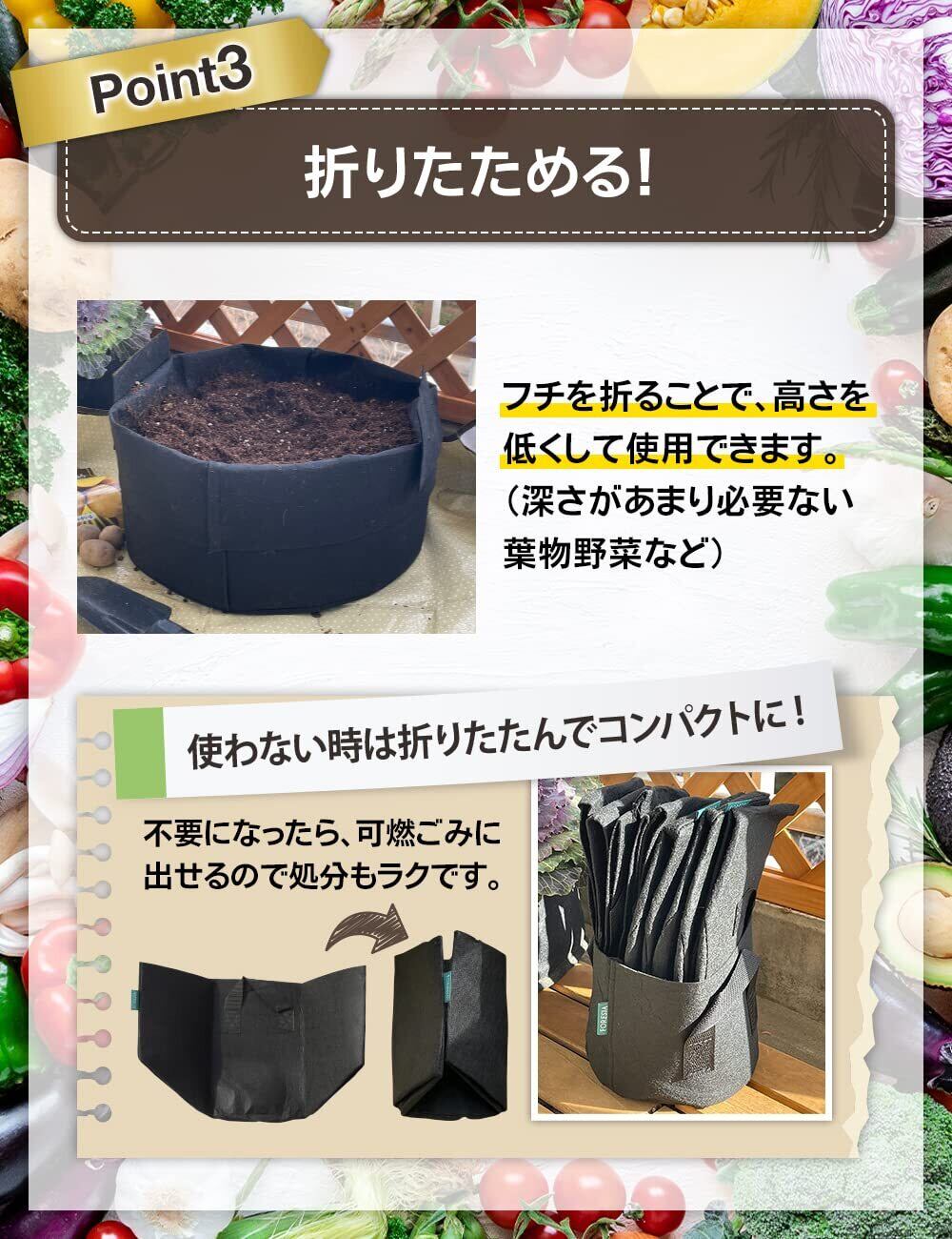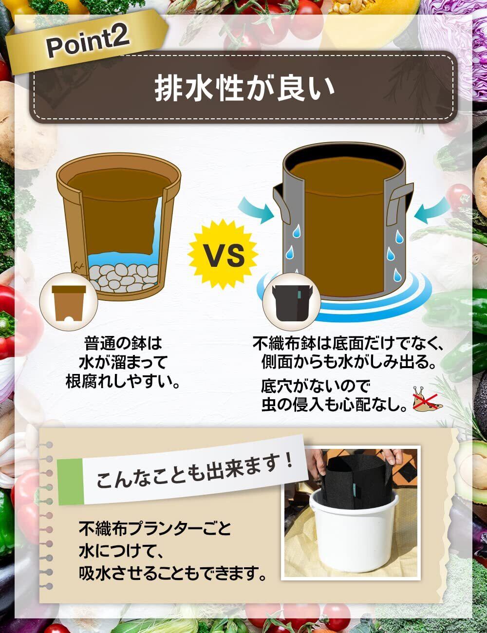 【植物の育ちが良い】布製だから通気性、透水性が良い!側面・底面全体から水がしみだして、根腐れの心配がありません。底に穴を開ける必要もなく、鉢底ネットは不要。虫の侵入もありません。