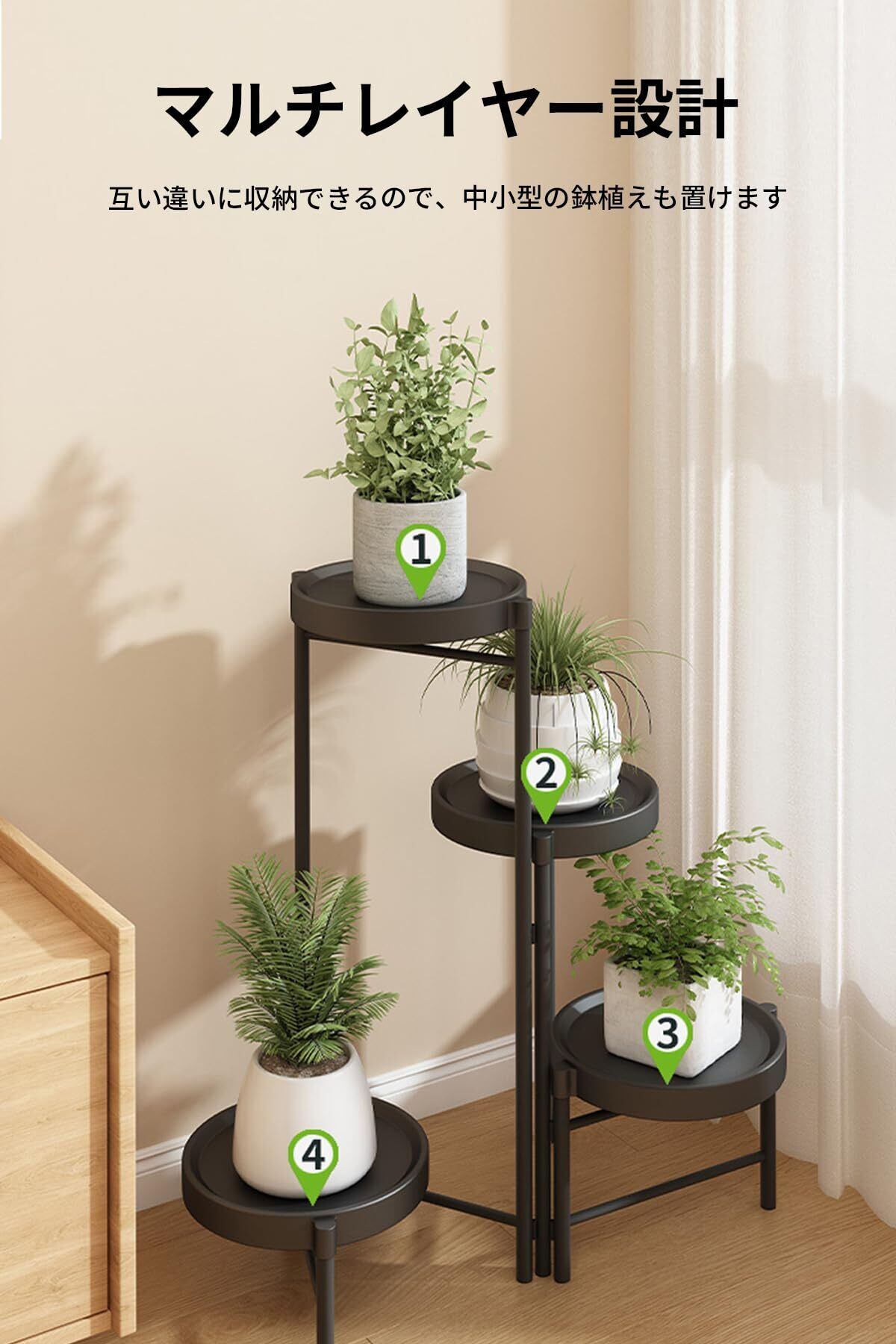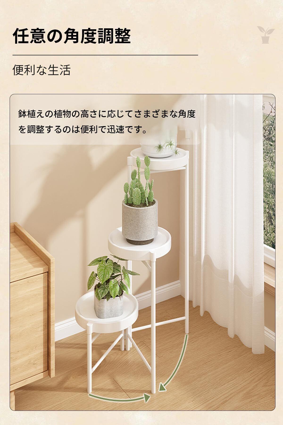 【組み立て簡単】付属のツールでピースを一緒にスロットし、すべてのネジを締めるだけで、植物スタンドをより硬くします。あなたの美しい植物を展示する以外に、このフラワースタンド 花台を使用して、お家や店舗の雰囲気を格上げしましょう、空間に新たな魅力を加えます。