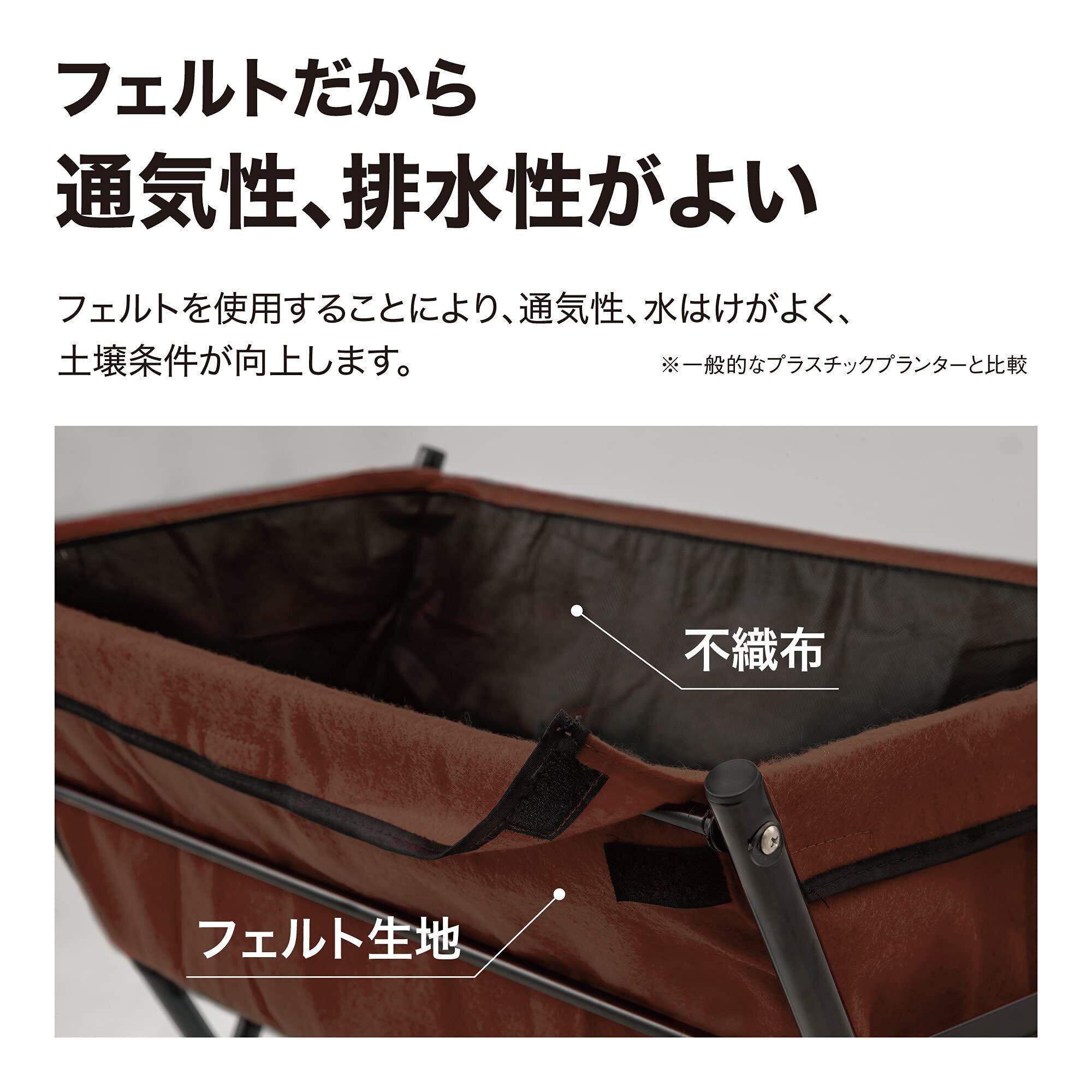 プランターバッグは**ポリエステル・ポリプロピレン**製で、通気性と水はけに優れ、軽量化を実現しています。