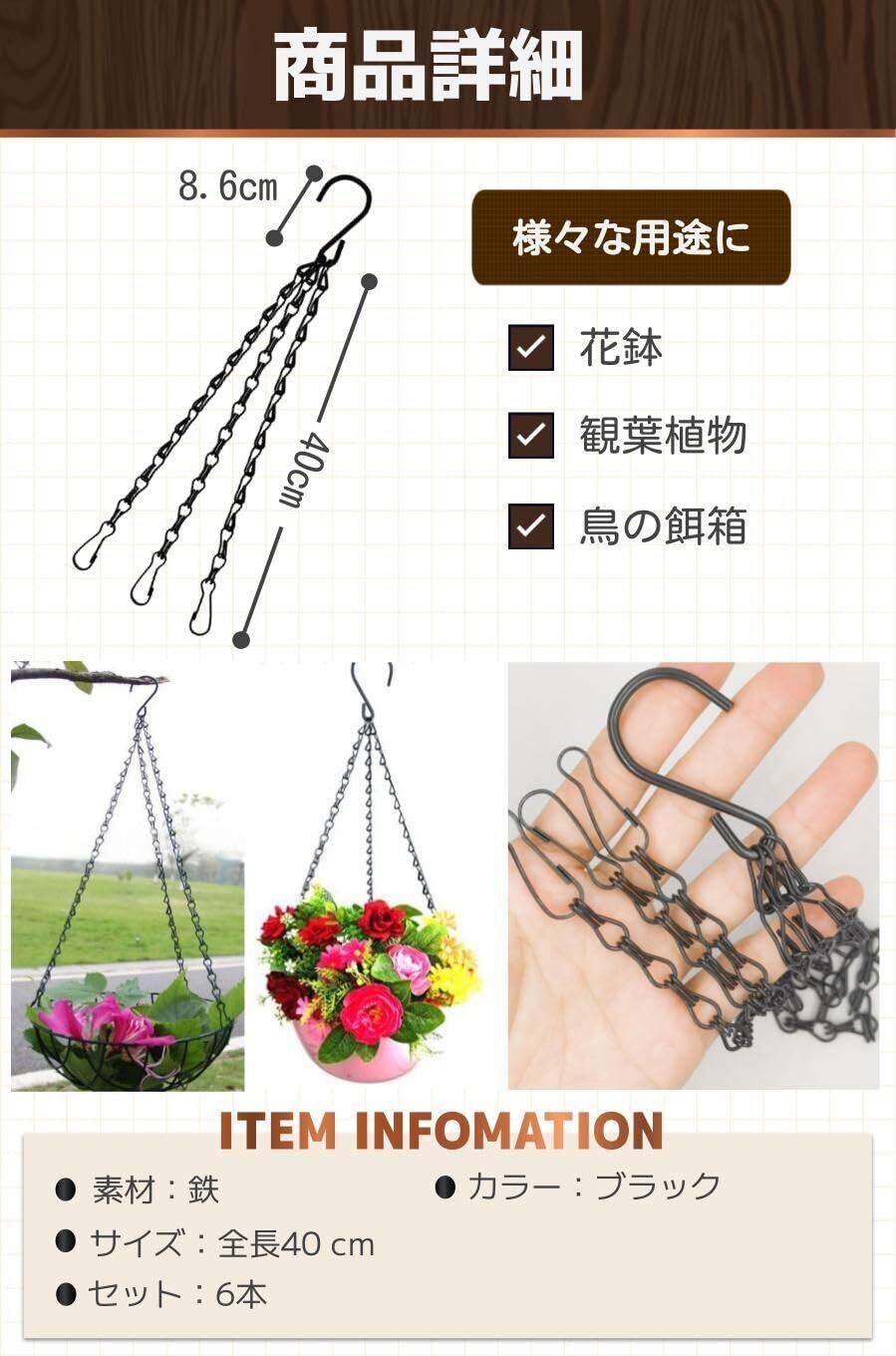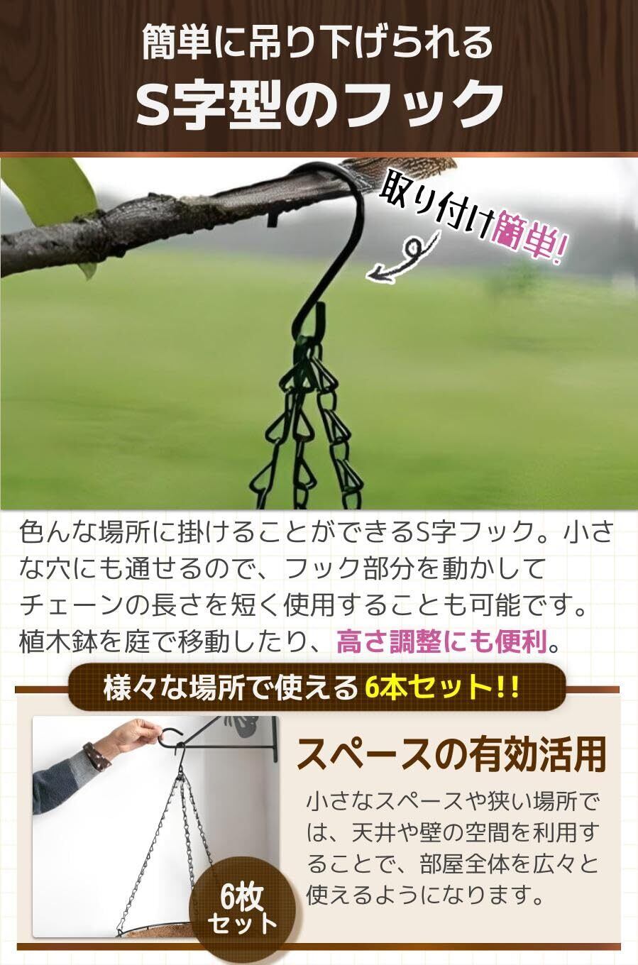 【S字型のフック】色んな場所に掛けることができるS字フック。小さな穴にも通せるので、フック部分を動かしてチェーンの長さを短く使用することも可能です。植木鉢を庭で移動したり、高さ調整にも便利。