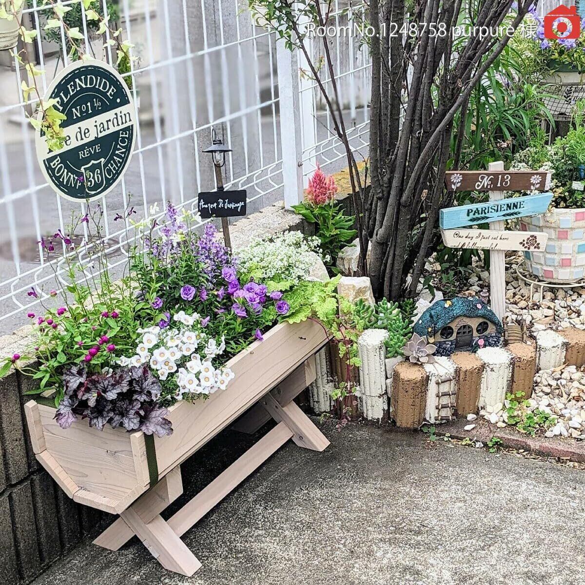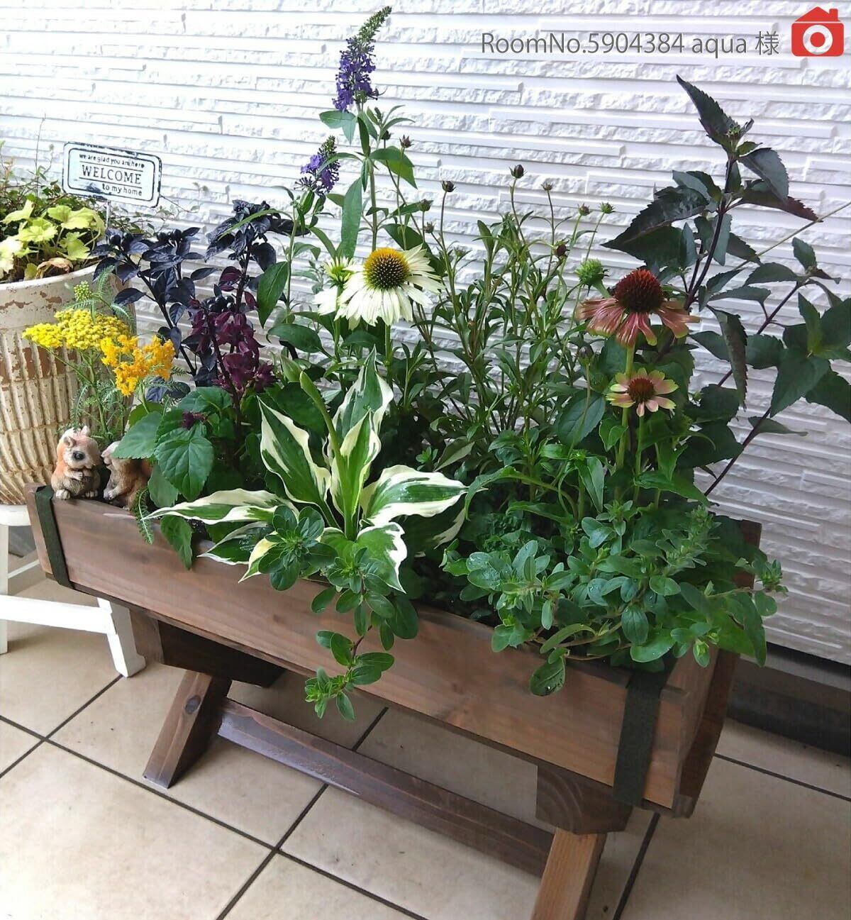 【寄せ植えが映えるプランター】 草丈の高く伸びる植物はプランターの後方に配置し、低い植物は手前に配置することでバランスのとれた美しい印象を演出できます。奥行きのあるプランターなので、前後に1つずつ植えることができ、寄せ植えのバランスを取りやすいのが◎。 また、X脚があることで、プランター自体も高くなりますので、枝垂れる植物にもおすすめです。