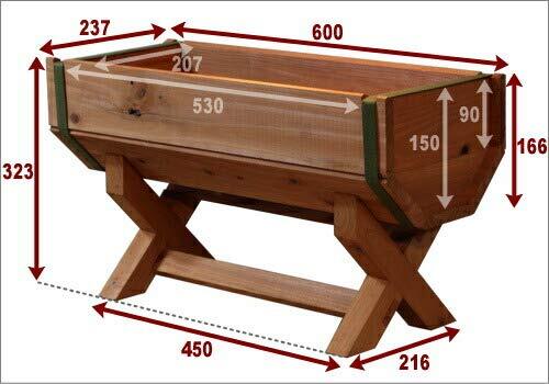 外寸:幅60cm×奥行23.7cm×高さ32.3cm 容量:14.7L 重さ:2.9kg(プランター2.2kg、脚0.7kg) 底板:水抜き穴2個、取り外し不可 補足:プランター両端のバンドは強度向上のため取り付けております。取り外しはしないようお願いします。