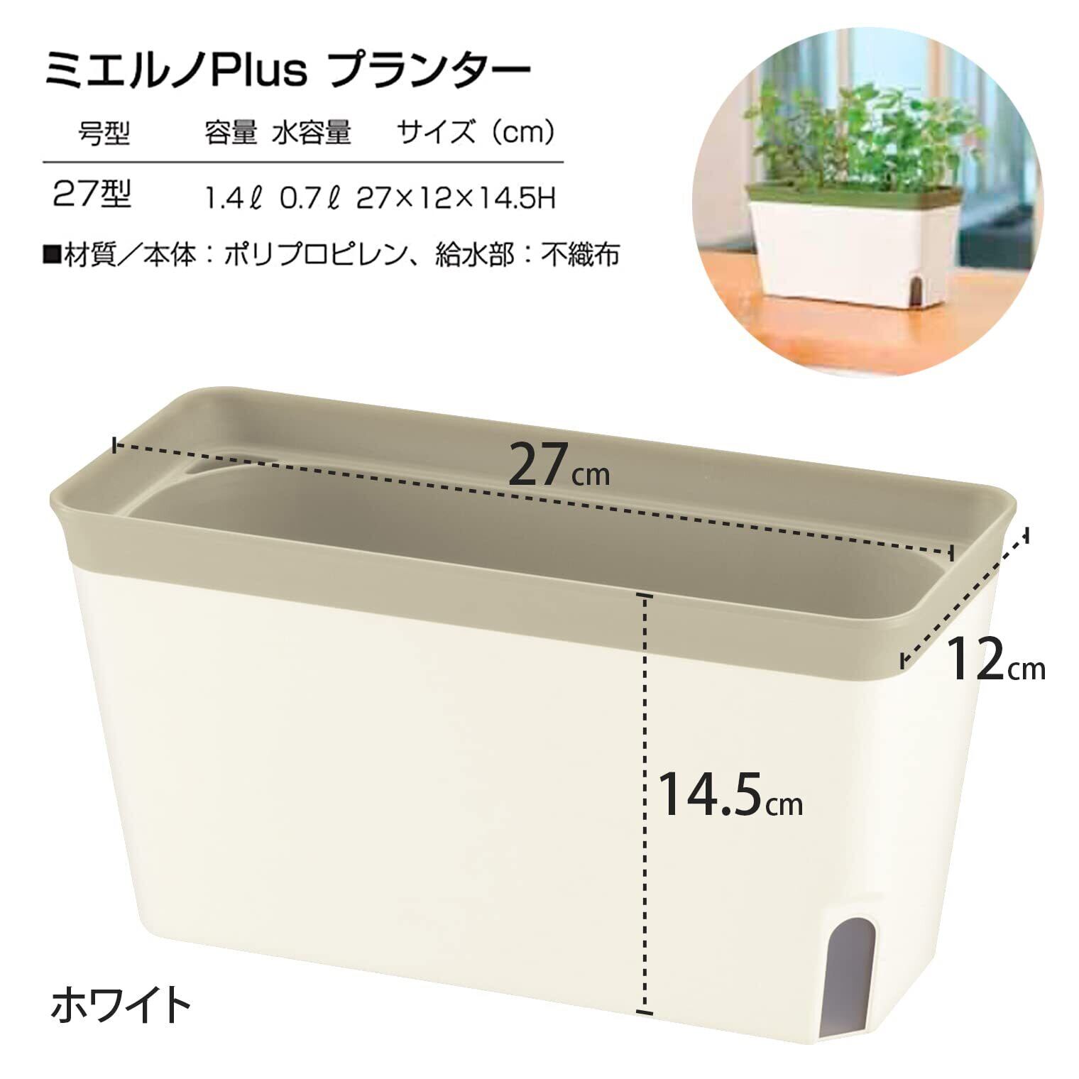 リッチェル 底面給水 ミエルノPlus プランター 27型N ホワイト 700979 土容量 1.4L、水容量 0.7L