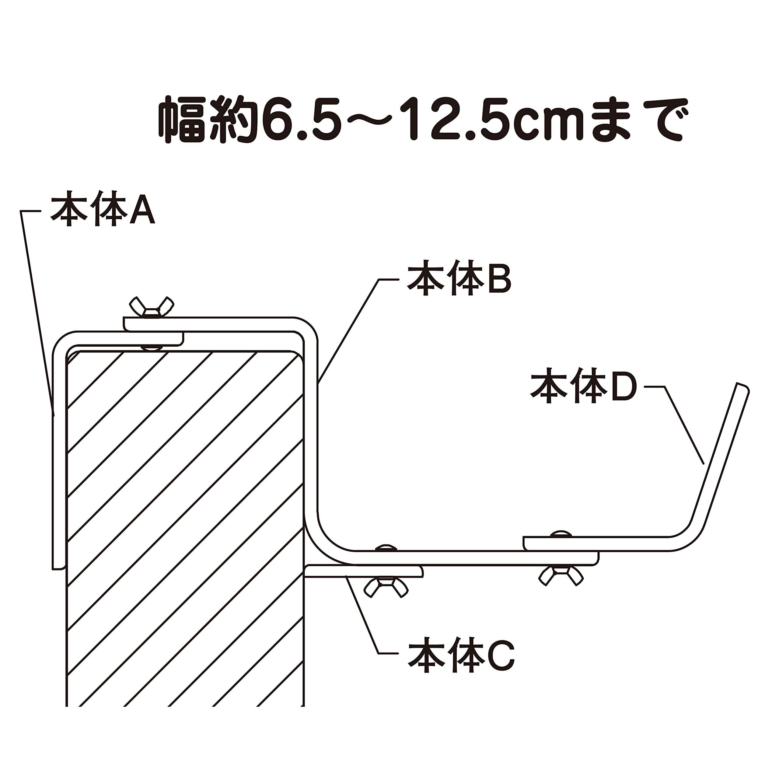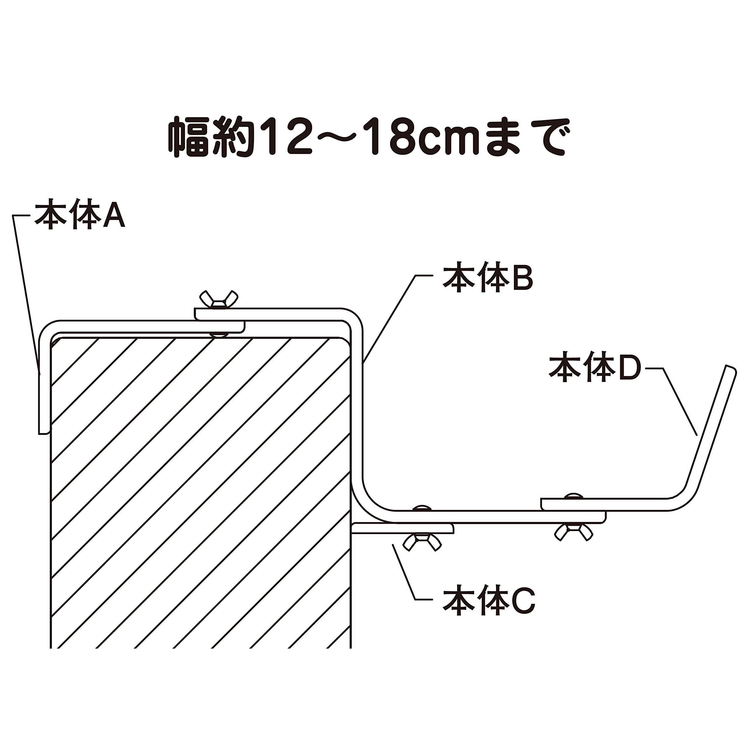 ブロック塀などにプランターを取り付けることができます。壁面にプランターを飾るためのブラケット。幅調整が出来るフック型。奥行きに合わせて10~18cmまでのプランターに対応。ブロック塀などの平らな部分にブラケットを挟みこんで固定することで2本のアームがしっかりと支えます。