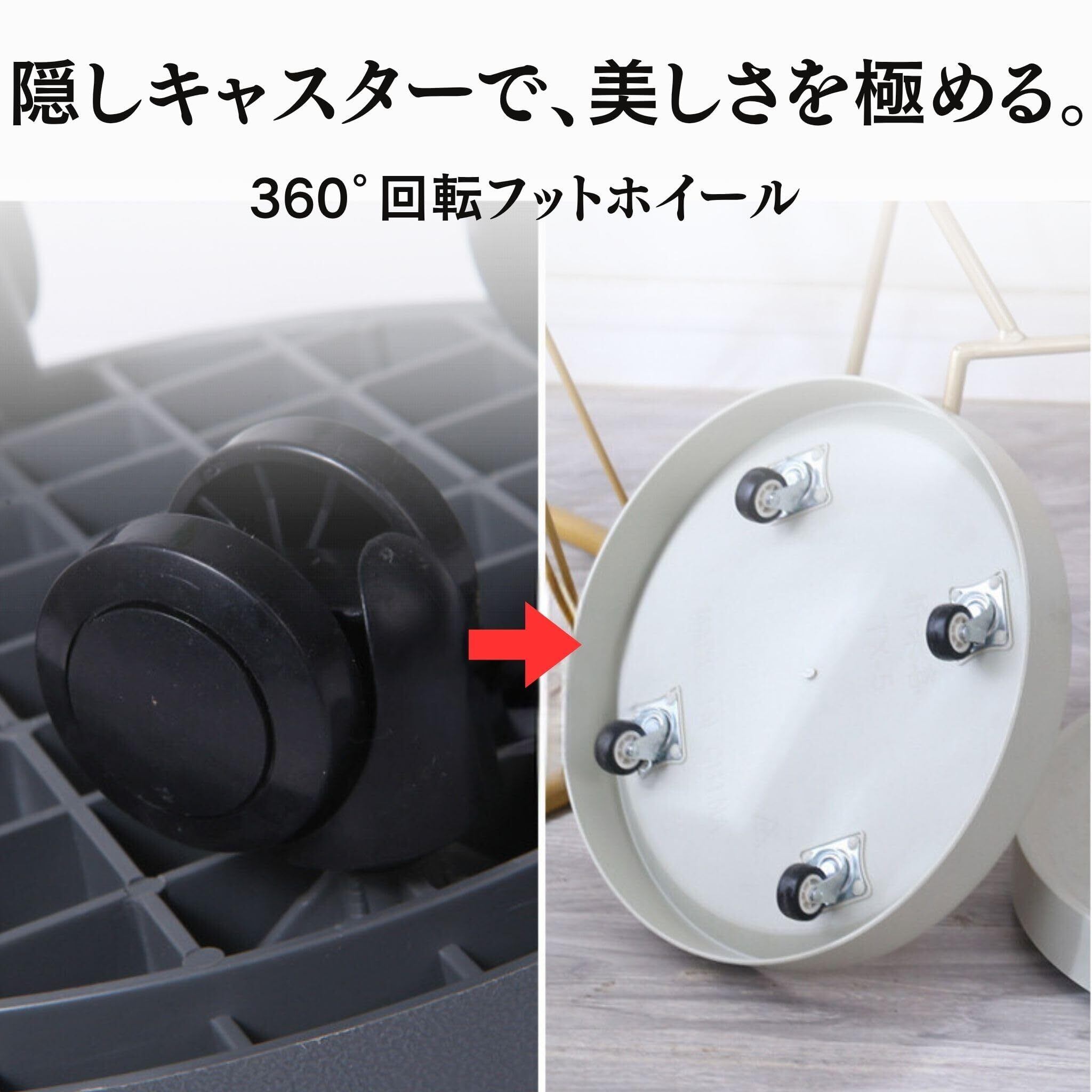 (便利な360°回転フットホイール)ステンレス鋼製の高品質な360°回転フットホイールが特徴です。これにより、プランタースタンドを簡単に動かすことができ、植物の日向の向きを調整するのが容易です。また、ホイールはゴム製で静かに動作し、床を傷つけることなく、毎日の掃除や水やりをスムーズに行えます。