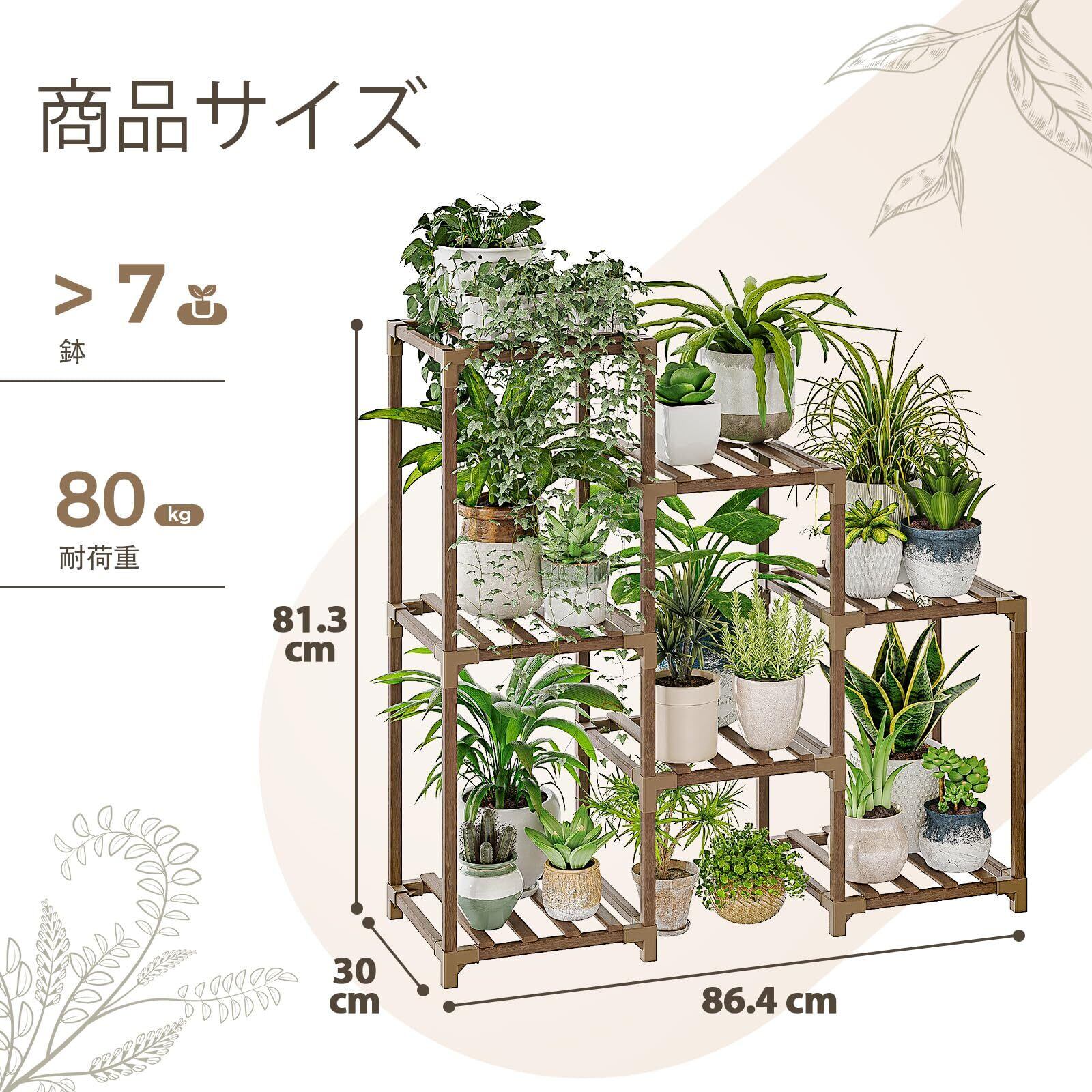 7鉢ガーデニング 棚:梯子型デザインで日光がスムーズに差し込み、7鉢以上の植物を収納可能。植物コレクションを整然と飾る装飾性も兼ね備え、屋内はもちろん屋外でも使えます