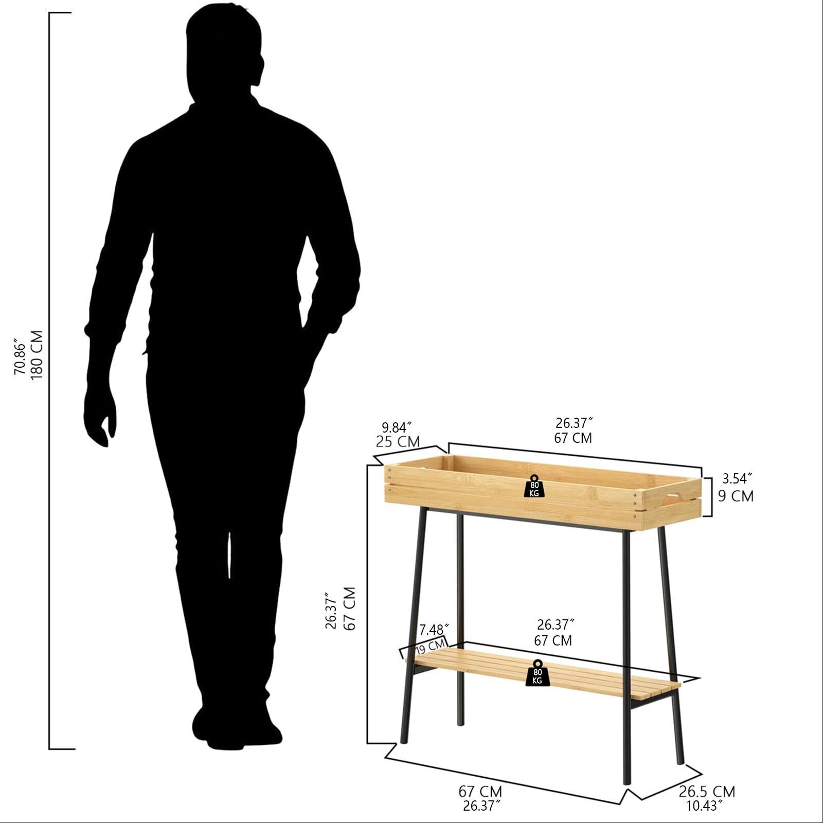 【スタイリッシュで頑丈な構造】 ブラックスチールフレーム×2段竹製棚板の組み合わせで、シンプルかつモダンなデザインを実現。耐久性に優れた金属フレームと天然竹の風合いが調和し、リビング・バルコニー・庭園に最適な存在感