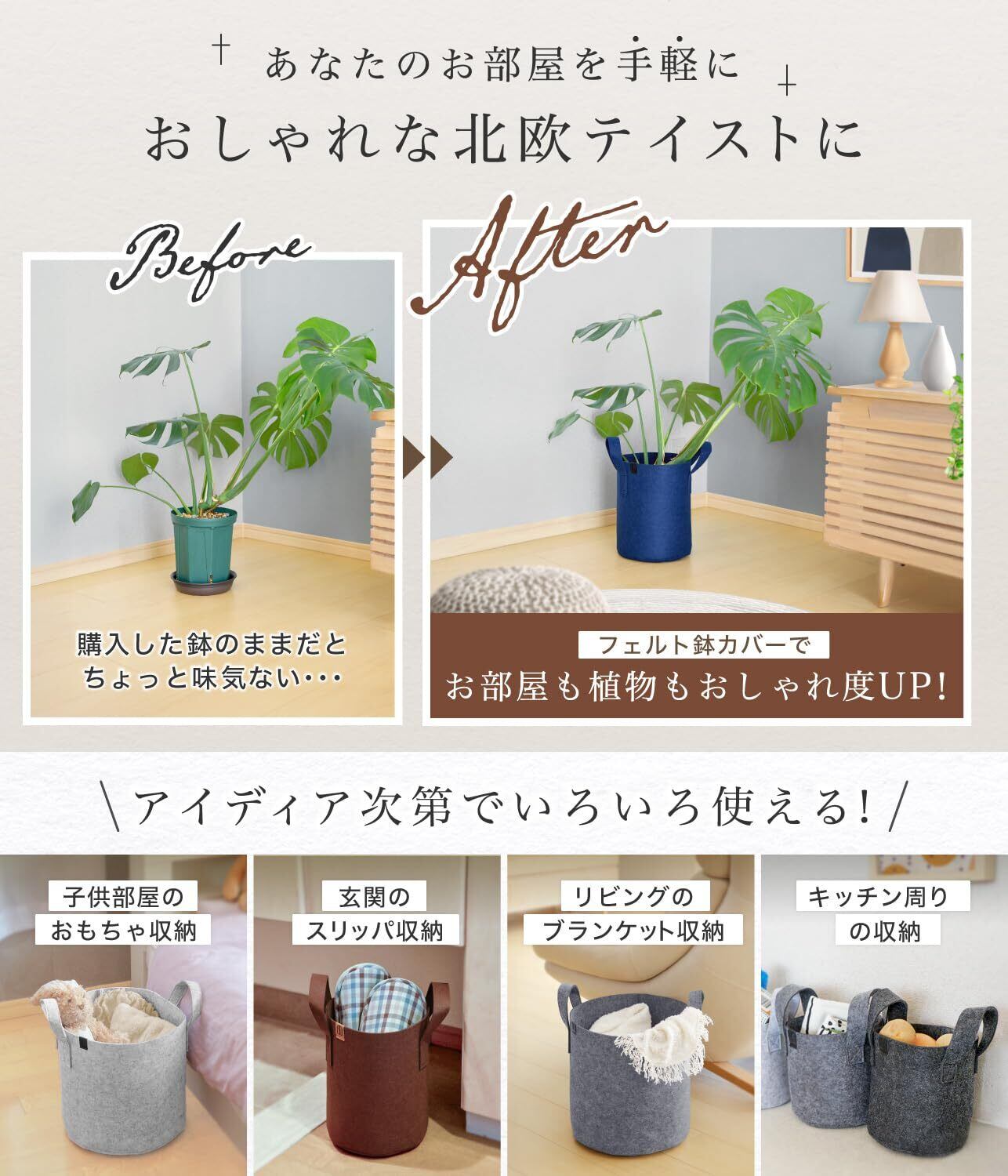 【アイデア次第でいろいろ使える】フェルト製の植木鉢カバーは、観葉植物をおしゃれに見せるだけでなく、実用性も兼ね備えています。子供部屋のおもちゃ収納や玄関のスリッパ入れ、リビングのブランケット収納、キッチン周りの小物収納や野菜や果物入れなど、アイデア次第で様々な用途に活躍します。