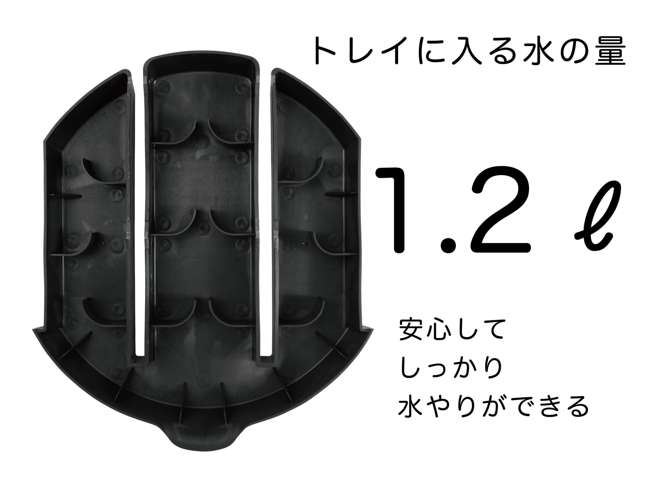 【ポットキーパーの特徴】 1.トレイから水が飛び出しづらい特殊なデザイン。トレイには水の流れを逆流させ、前に水が飛び出しづらくなるデザインが備わっています。水を捨てる際も波が立ちづらくなります。 2.本体内部でも少量の水を受けるための一体型設計。トレイ(受け皿)がないときでも、少量の水を本体内部で受けれるので、床に水がこぼれづらくなります。 3.重い鉢でも大丈夫。耐荷重は安心して使えるよう構造と素材はしっかりデザインしています。 4.許水量は1.2リットル。本体にキャスターをつけると水を受けれるトレイが小さくなるため、水をできるだけ多く受けることを重視したデザイン。移動させる場合、キャスター付きテーブル(別売)などをご利用ください。