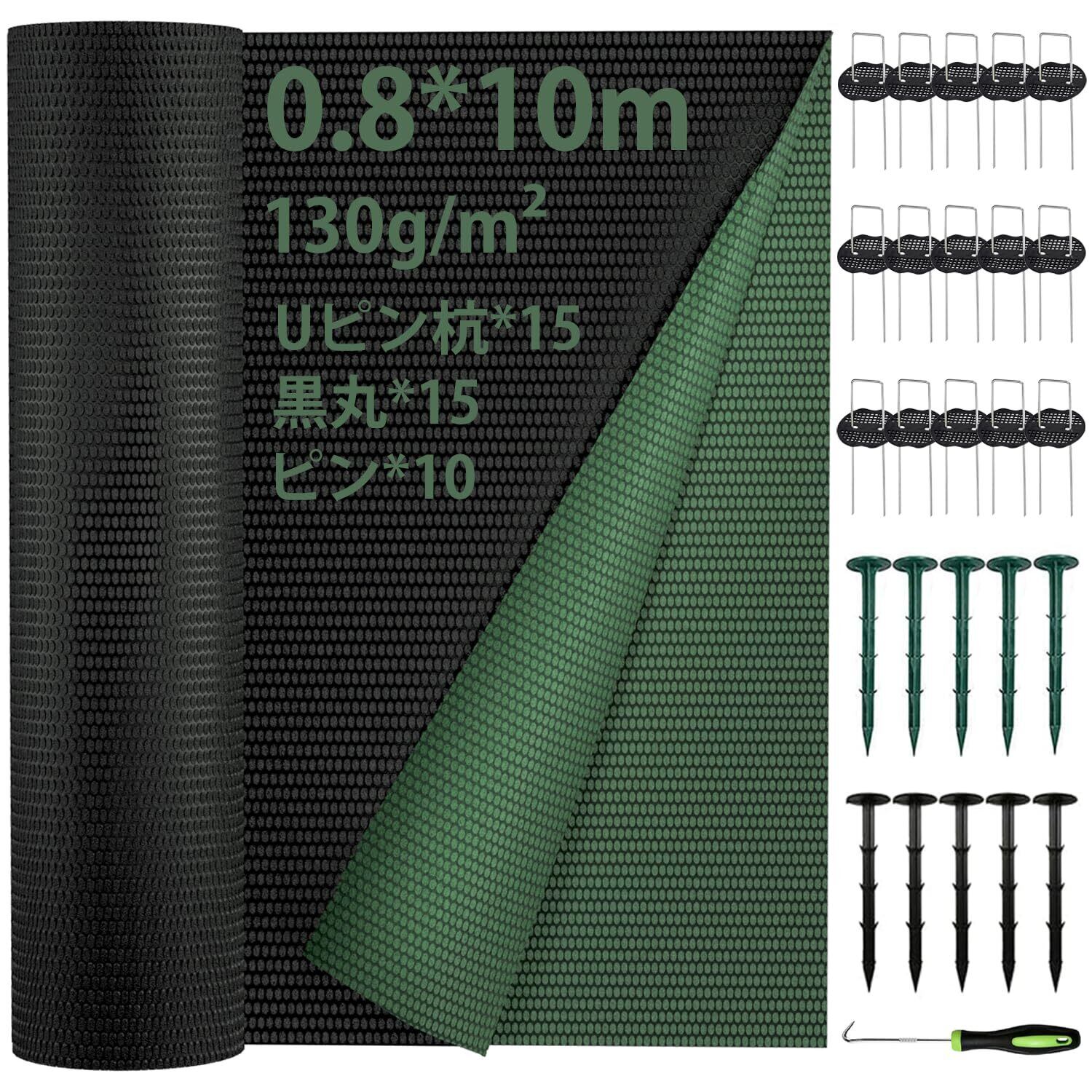 【特価セール】2025年新登場【緑黒両面】防草シート 0.8*10m 除草シート 130g/m²高密度 12年耐久 グリーン 黒両面使い トウモロコシ繊維 PLA製 丸穴設計 高耐久 高透水 厚手不織布シート 草よけシート UV剤入り 雑草防止 紫外線劣化防止 園芸用ぼうそうしーと スチール製Uピン杭15本と黒丸15枚付き (幅0.8mを幅0.4mに折り畳んだロールで出荷)
