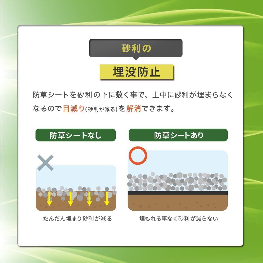 砂利下・人工芝下に、ポリエステル製のコストパフォーマンスが良い防草シートです。 【主要な特徴】高い防草効果:厚みと素材の強度により、雑草の根の成長を遮断します。 【耐久性】紫外線や風雨に強く、長期にわたって性能を保持します。 【通気性と排水性】適切な通気性と排水性を兼ね備えているため、土壌の健康を維持しながら雑草を防止します。