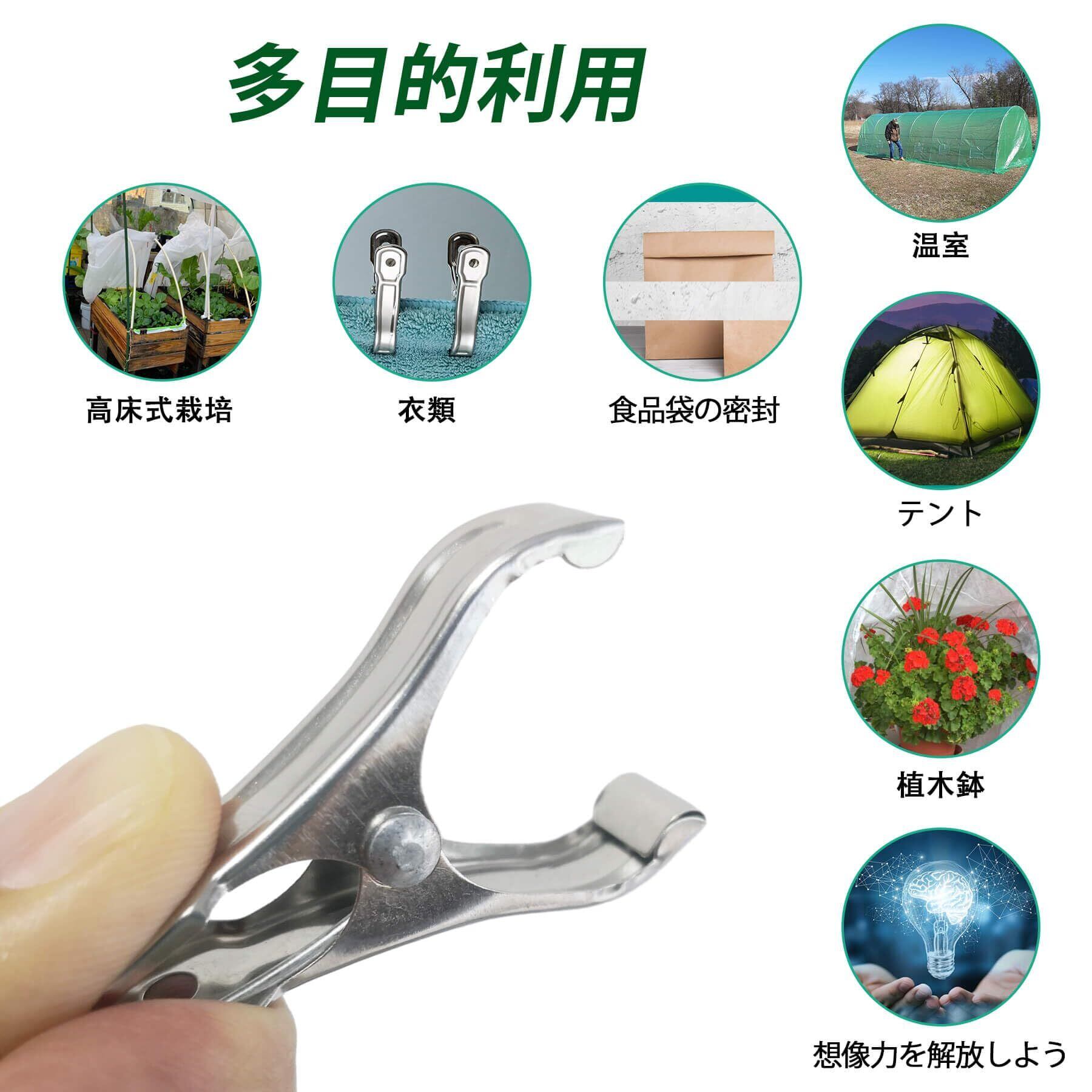 幅広い用途: 温室やビニールハウスのポリエチレンフィルム、防虫ネット、日よけネットの固定に活躍する園芸用クリップ。トンネル栽培のフィルム押さえ(トンネルパッカー)としても。この温室クリップは、園芸だけでなく、食品袋の密封や洗濯物の固定、オフィスでの書類整理、写真やカーテン、ビーチタオルを掛ける際など、さまざまなシーンで活躍します。