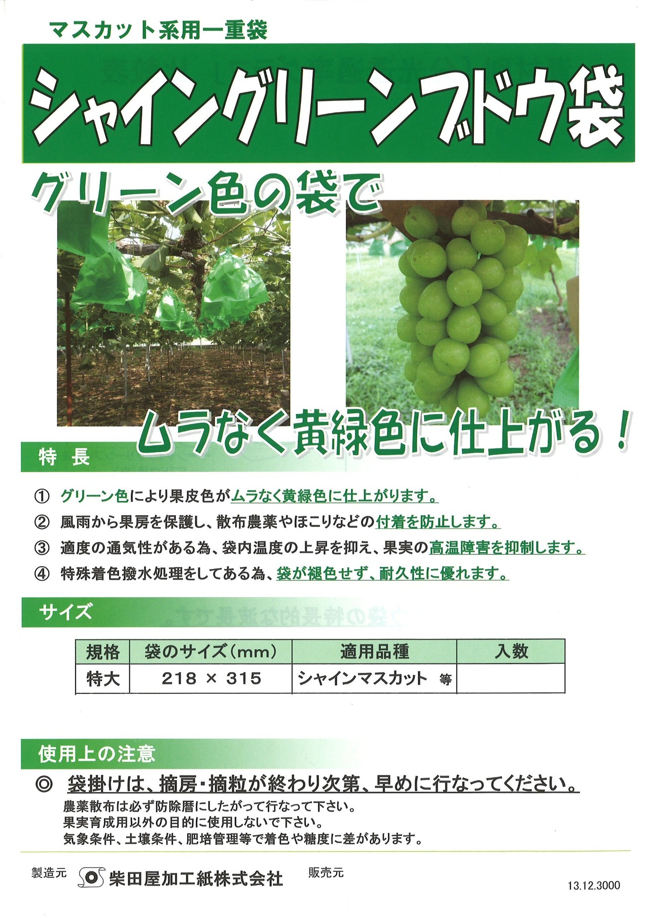 マスカット系ぶどう(緑ぶどう)専用果樹袋です。 グリーン色の袋でムラなく黄緑色(果皮色)に仕上がる!