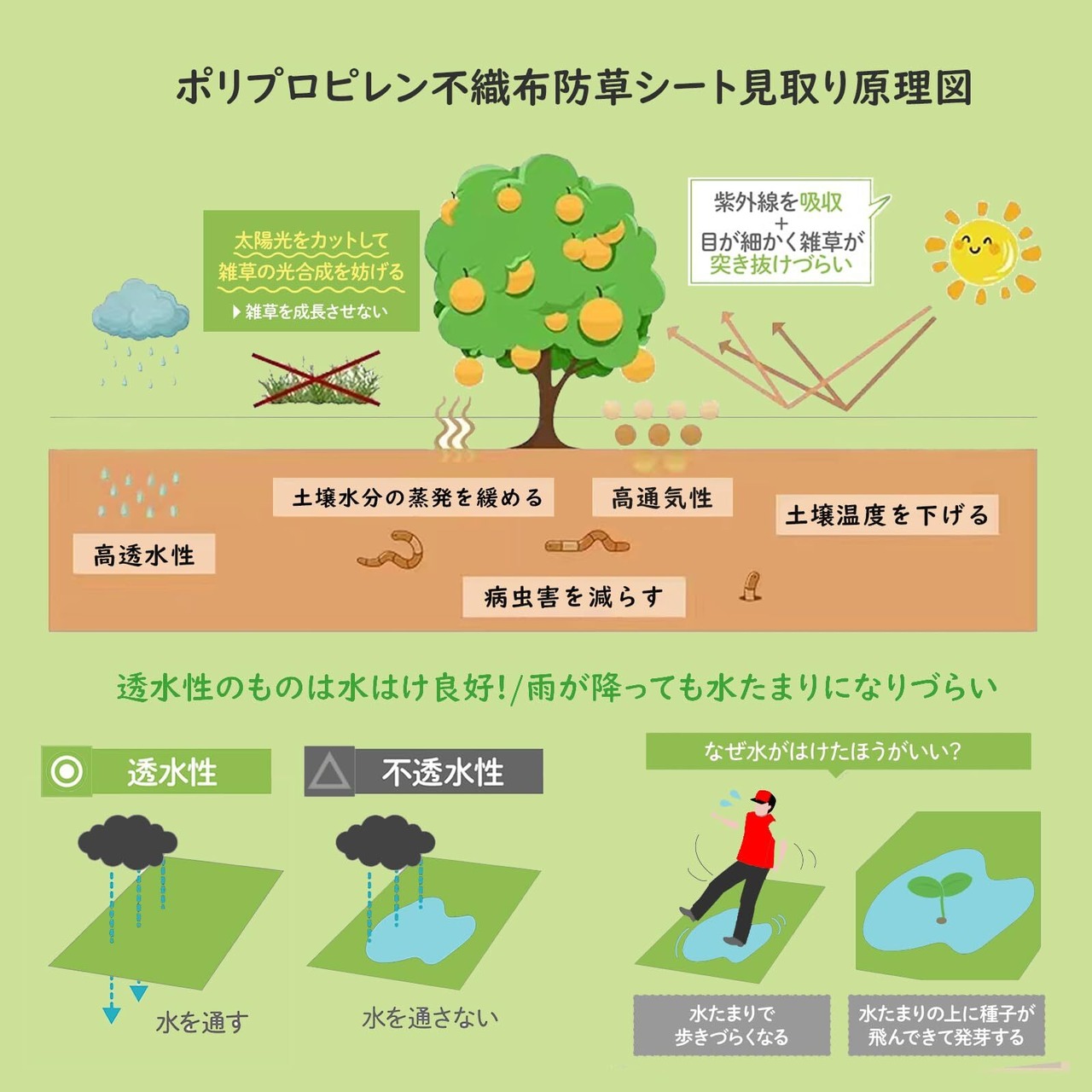 【水はけ良好】の防草シートは丸穴設計目詰まりしにくく排水性に優れているので、水がたまらず土に浸透し、作物の成長を促します。雨天時の通水性も優れており、水たまりになることも無く快適です。土壌の養分を保持し、作物や花木の生育を守る。