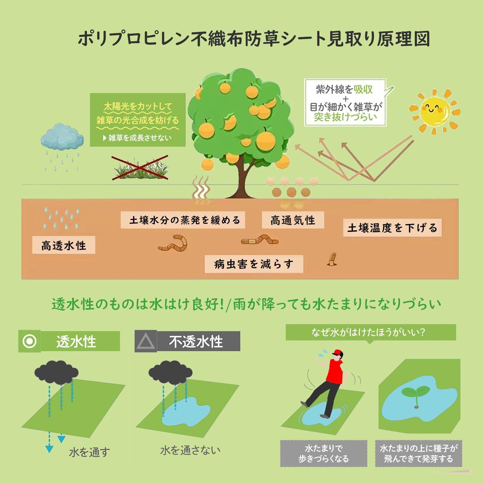 【優れた遮光性】防草シートは高品質の耐候性不織布を採用しており、日光を遮り雑草が生えにくいです。遮光率最大95%なので光を遮ることで光合成を防ぎ、化学除草剤を使用せず、生分解性があるため、使用後の自然分解が可能。環境保護にも貢献します。