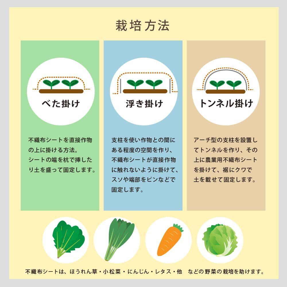 農業用不織布シート、パオシートは、農作物の保温や霜よけ、風よけ、乾燥防止、害虫、鳥害対策目的としてご使用頂けます。通気性があり、適度な湿度を保ち、地温を高めることによる、発芽や生育を助けます。主にべた掛け、うきがけでのご使用ができます。草丈の低い葉菜類や根菜類にべたがけをすれば、作期拡大や品質向上の役に立ちます。