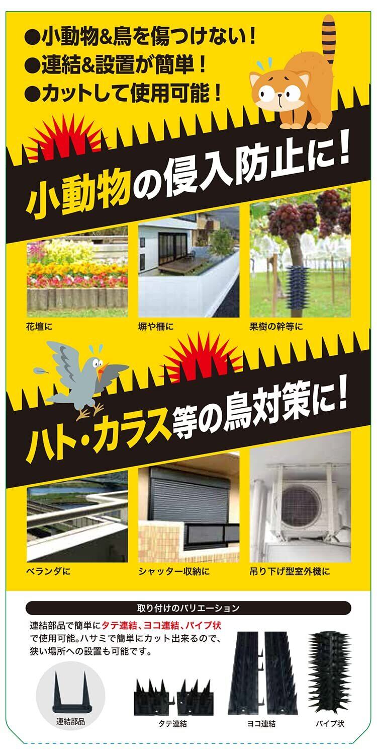・ネコや小動物の歩行する場所や侵入経路に並べることで、建物・敷地へのを防ぐ効果がある