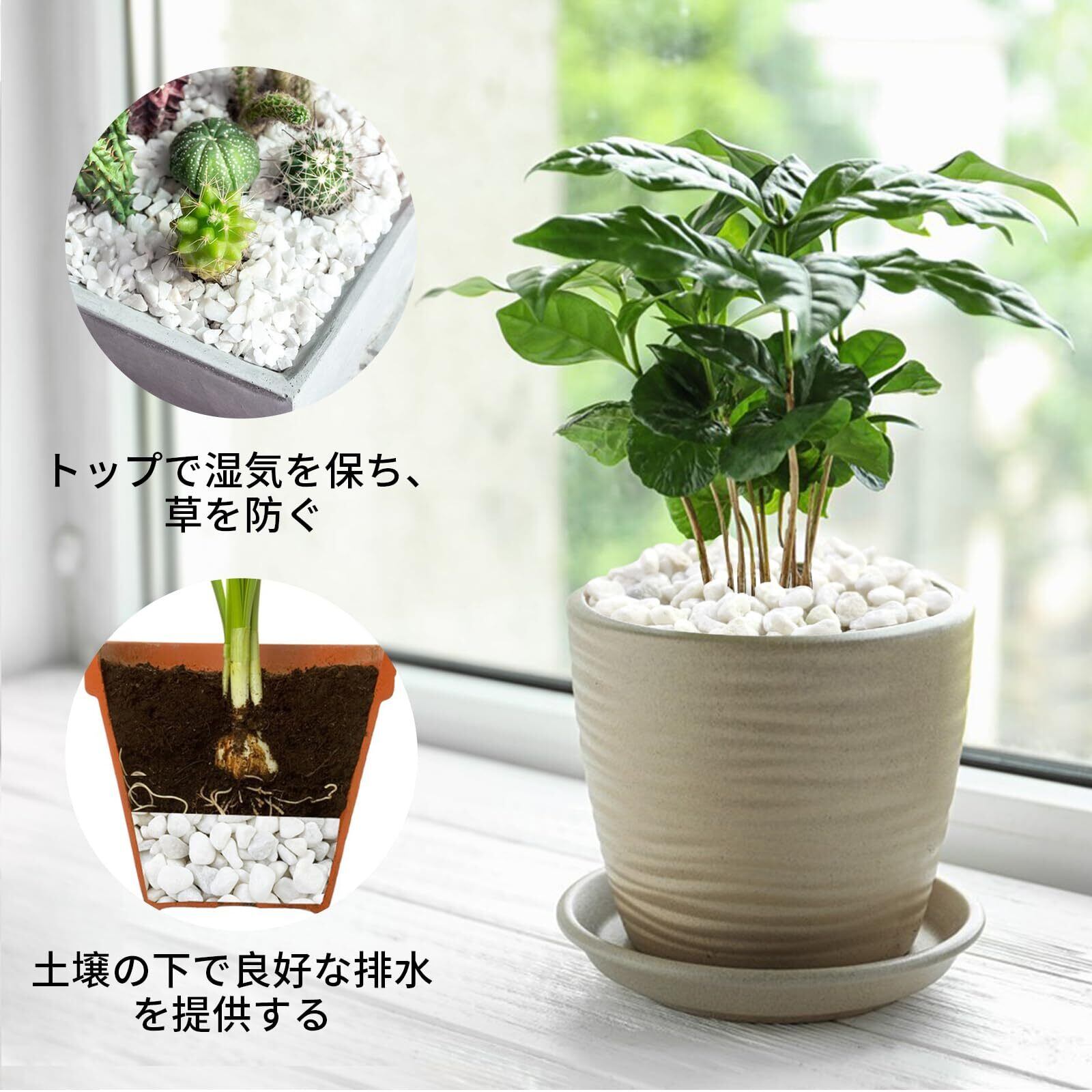【用途】植物用景観石・防犯砂利・庭園石としてもご活用いただけます。石を敷設することで、土壌の温度変化を抑え、水分の蒸発量を減少させる効果があります。これにより乾燥防止に貢献し、植物の健全な成長をサポートします。