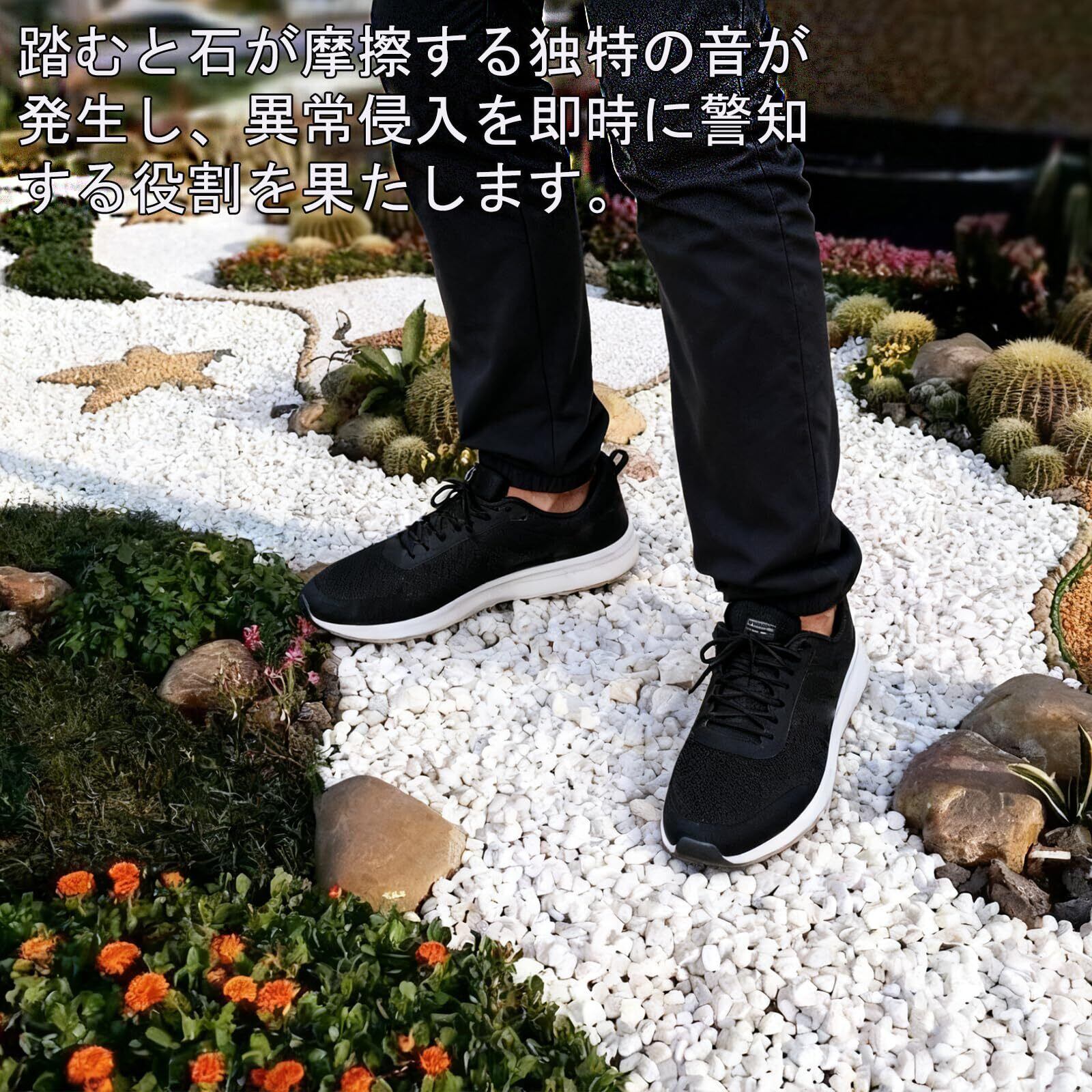 【防犯機能付き】天然石材の敷設により、不法侵入者を防ぐ効果があります。踏むと石が摩擦する独特の音が発生し、異常侵入を即時に警知する役割を果たします。