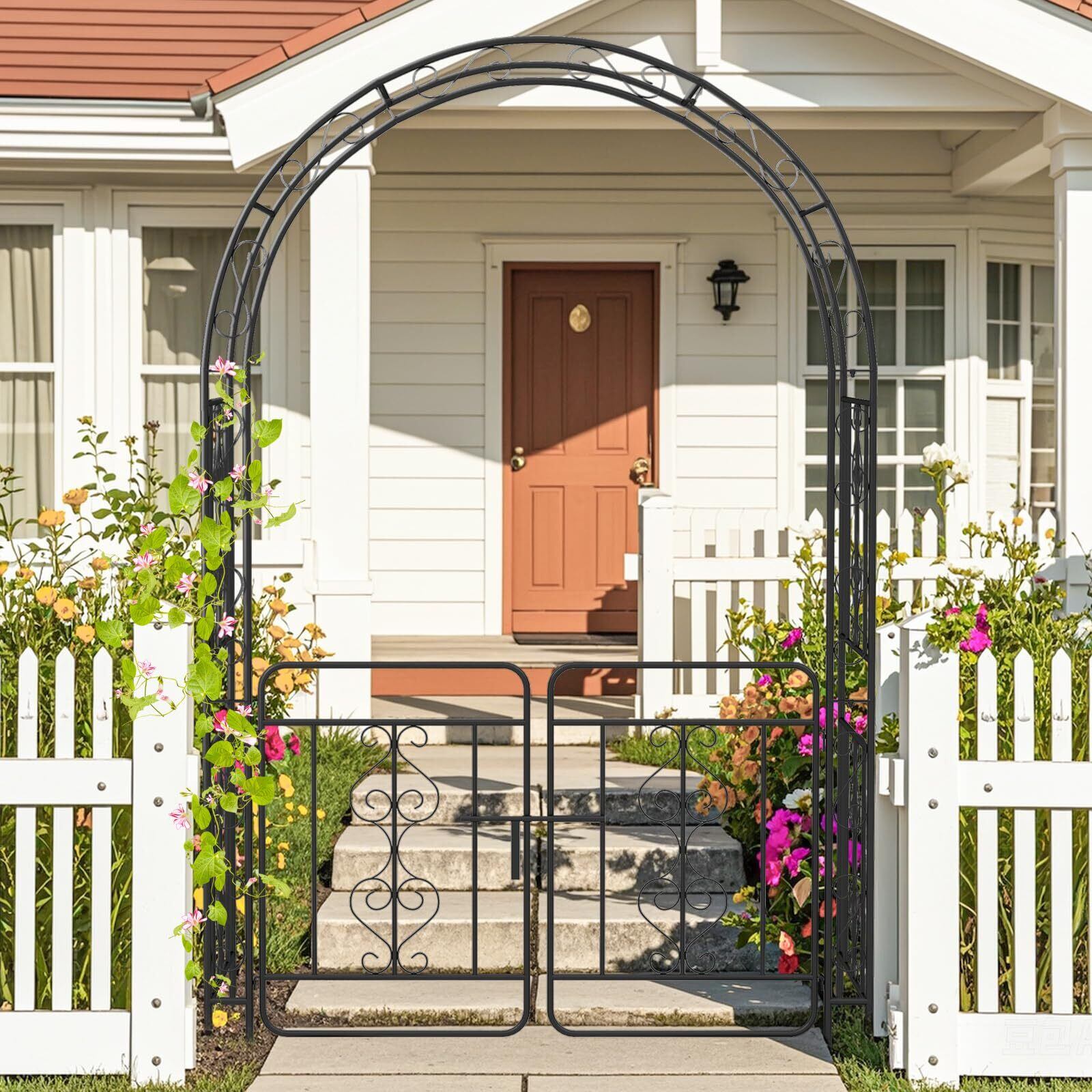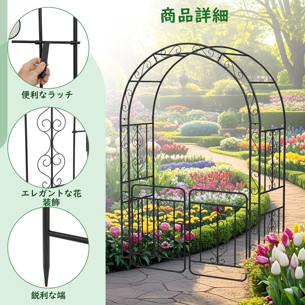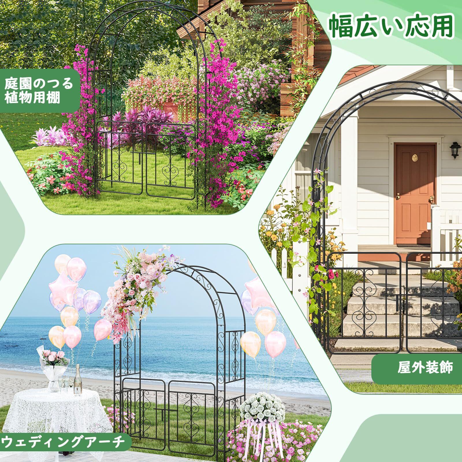 [魅力的な入り口]: バラアーチには、精巧な扉が備わっており、堅固に施錠可能です。これにより、静かな庭園に魅惑的な入口を演出します。