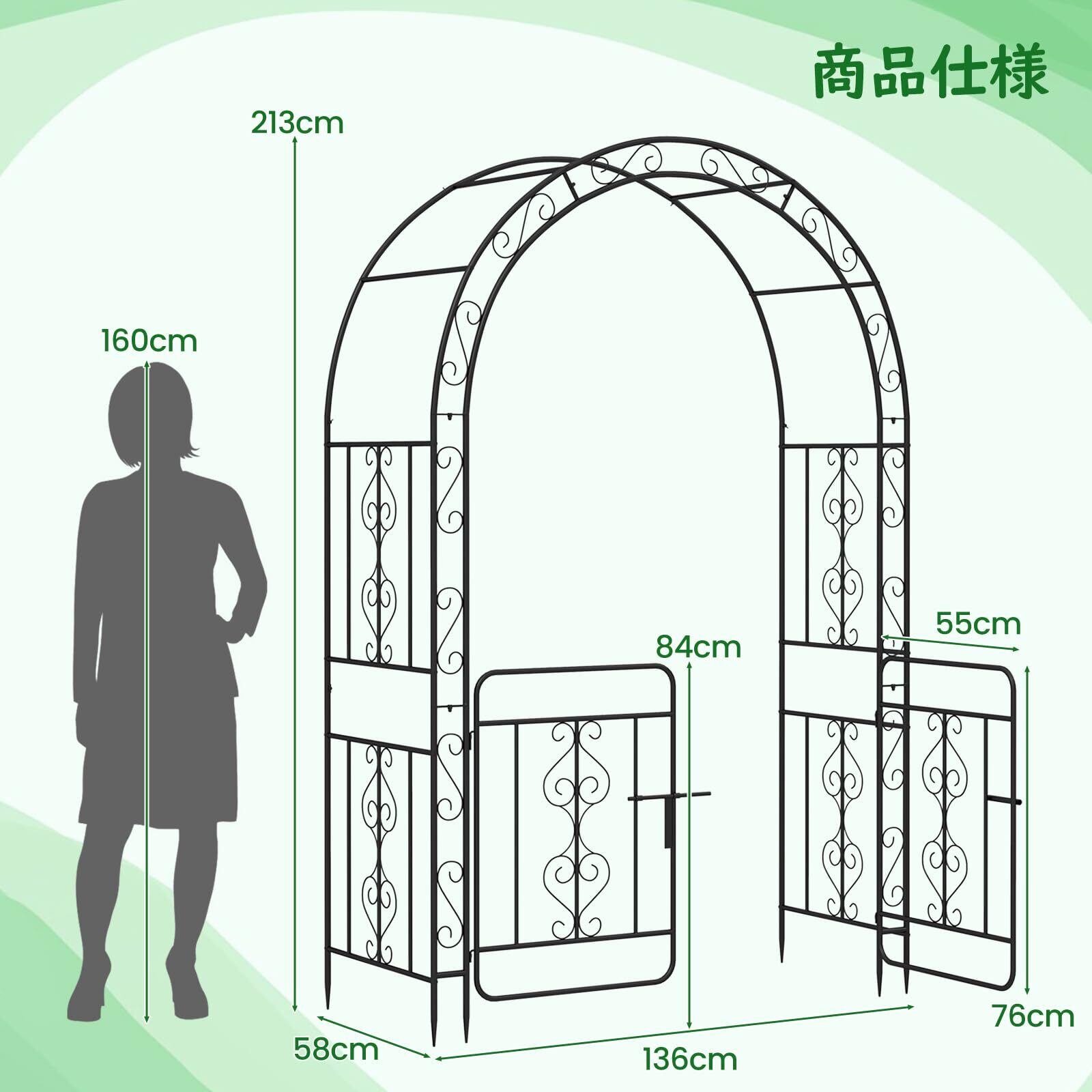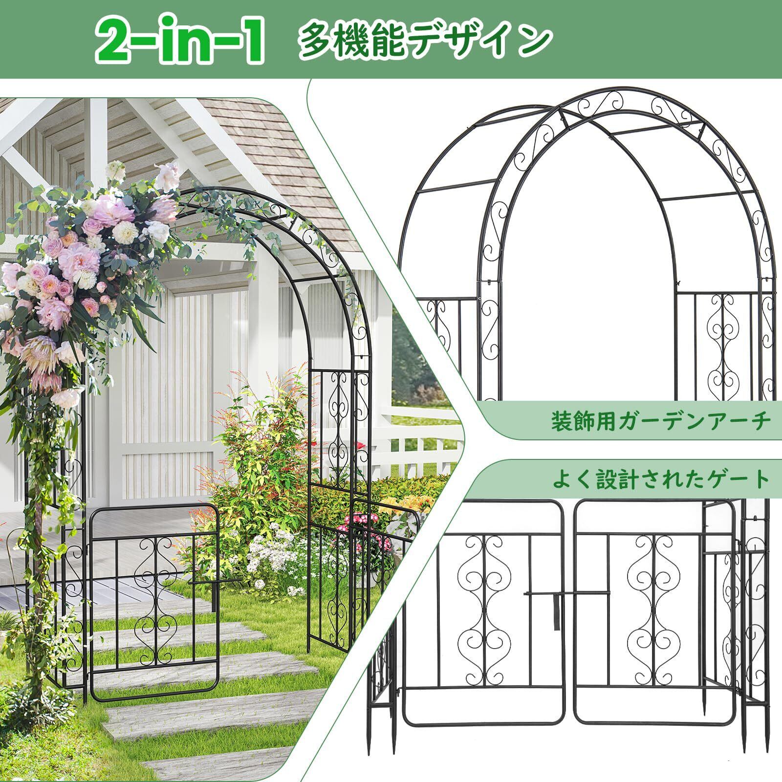 COSTWAY 鉄製 ガーデンアーチ ゲート付き バラアーチ フラワーアーチ 幅136x奥行58x高さ213cm バラ アーチ バラのアーチ ガーデン アーチ ガーデニング アーチ ガーデニング用品 園芸用品 防錆 ぶどう棚 屋外藤棚キット 葡萄棚 バラ つる性植物(ゲート付き)