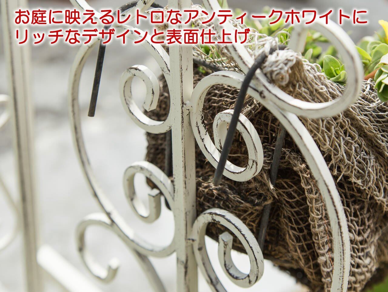 形状: 組立て式 ※土中固定用ペグが付属します。 生産国: 中国(企画は日本) 【注意事項】アンティークな風合いを表現するために、白の上からエイジング塗装をしてあります。真っ白なホワイトではなく、塗装不良や使用によるダメージではございませんので、予めご了承の上お求めください。