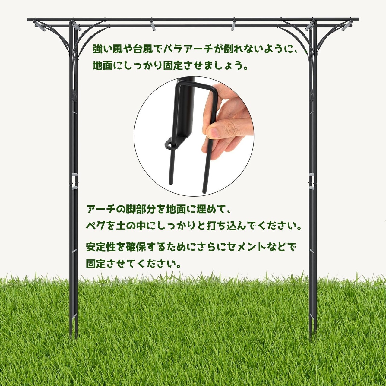 強い風や台風でバラアーチが倒れないように、地面にしっかり固定させましょう。アーチの脚部分を地面に埋めて、セメントなどで固定させます。