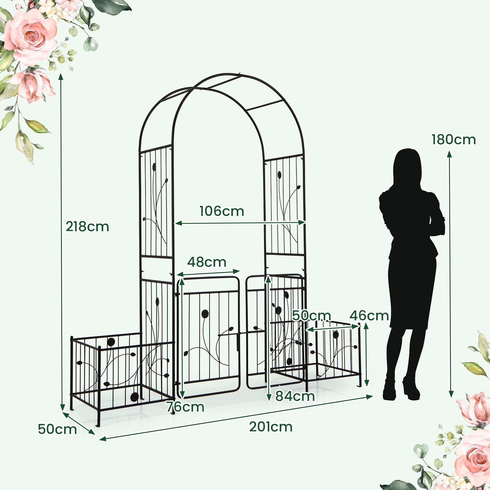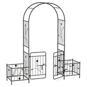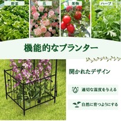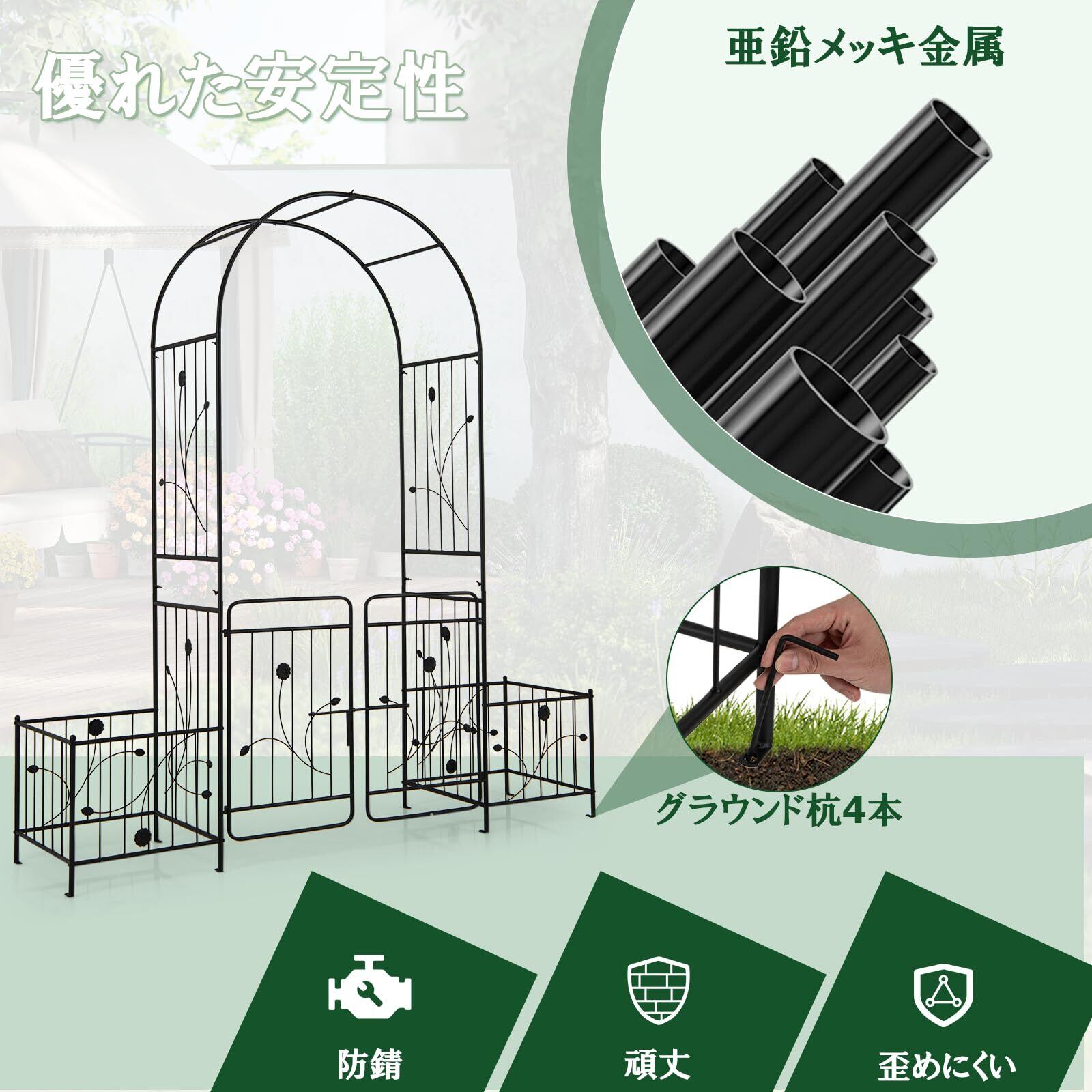 【鉢置き台付き】中央にガーデンアーチが設けられており、人々が通り抜けやすい構造となっています。両側にはオープンエンドのプランターが付いており、つる性植物や装飾に適しています。装飾的なアーチだけでなく、実用的でもあるプランターです。