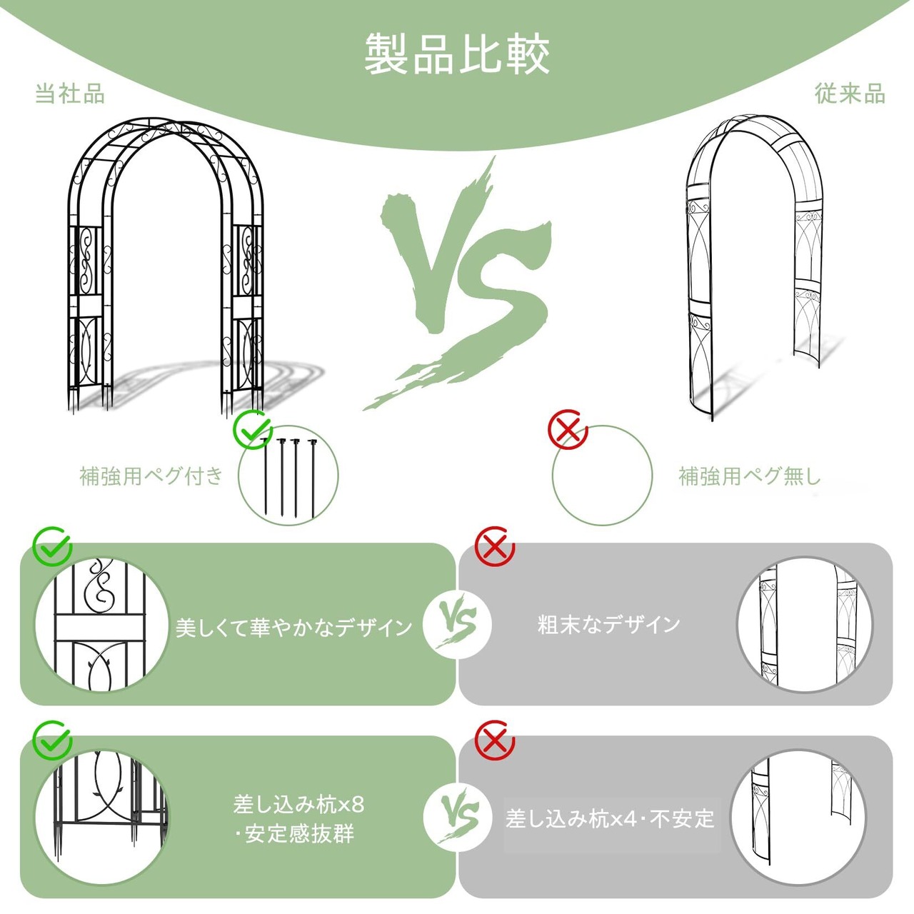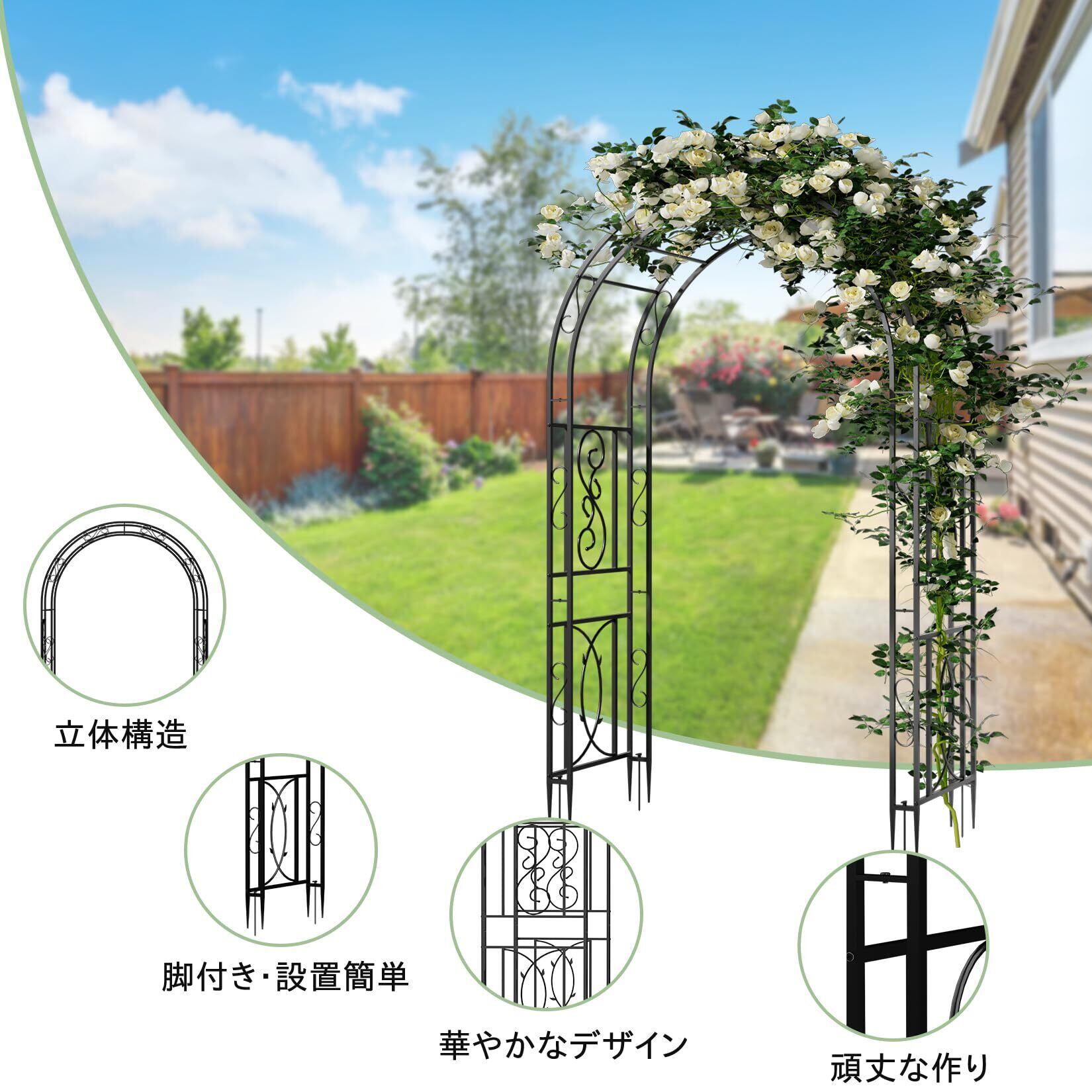 【立体構造で重厚感あるデザイン】アーチが二重になった立体感のあるデザインで、植物の成長をサポートするだけでなく、庭の装飾としても目を引く存在になります。スタイリッシュで機能的な庭園装飾で、存在感を演出できるため、オフシーズンでもお庭を華やかにしてくれます