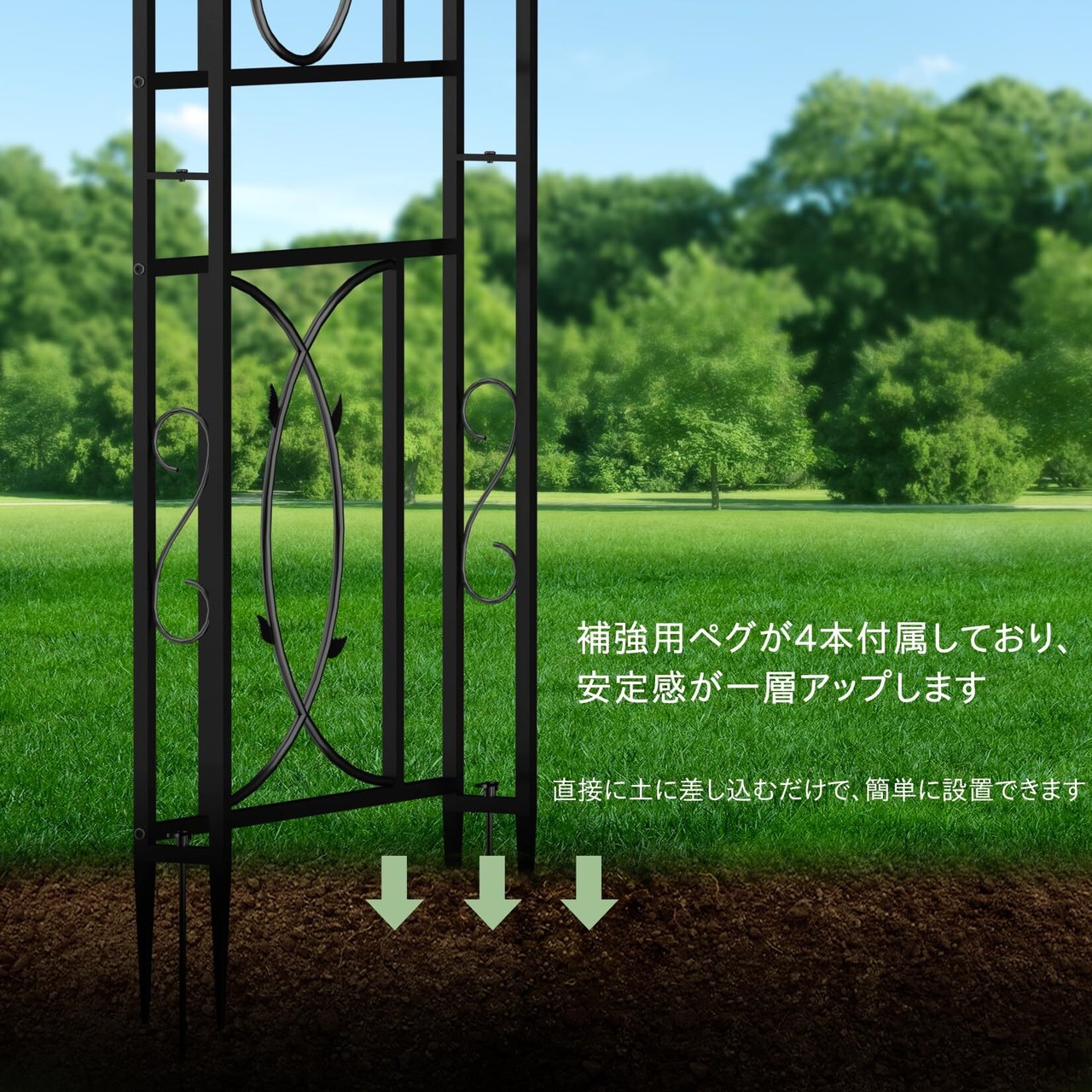 【設置簡単】脚部の先端が差し込み杭に設計されたため、別の工具が要らず、直接に土に差し込むだけで、簡単に設置できます。また、安定性を確保するために、長さ15cmのペグが4本付属しており、安定感が一層アップします