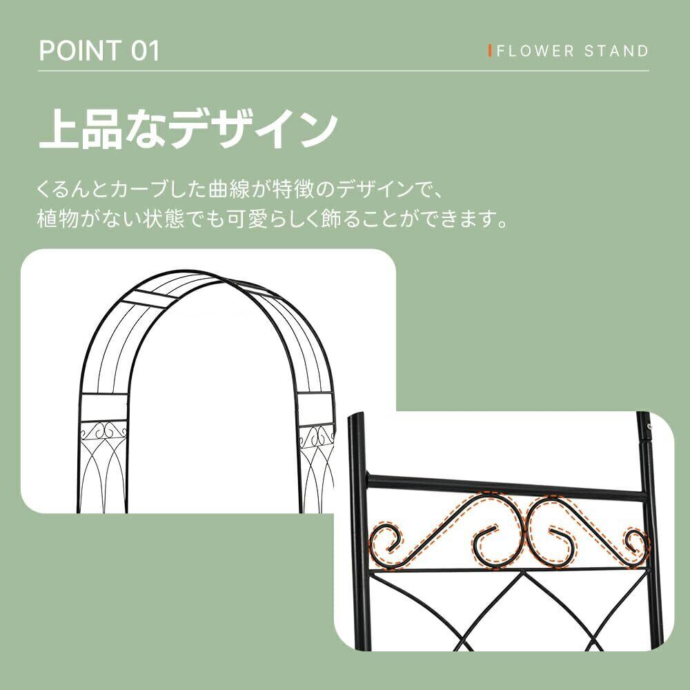 ◆01ガーデンを魅力的に演出するフラワーアーチ 一度設置すれば、四季折々の花々が咲き誇り、ツル性の植物が絡まりながら、まるで夢のような空間を作り出します。これだけで、ガーデニングの楽しさが倍増! いろんな場面で使えるフラワーアーチ..... ガーデン 通路 結婚式 ハロウィン ◆02上品なデザイン くるんとカーブした曲線が特徴のデザインで、植物がない状態でも可愛らしく飾ることができます。 ◆03高耐久素材 高品質なスチール製で、粉体塗装を施して、強風や雨にも耐える優れた耐久性。長年にわたって使用できます。 自由な飾り方 高さ224cm、幅110cmの広い空間には、さまざまなツル植物や花を絡ませることができ、庭全体が色とりどりの花で埋め尽くされ、自然と調和した美しい空間が広がります。 クレマチス ぶどう ローズ ◆04アンカーピン12本付き ガーデンアーチの転倒を防ぐアンカーピン付き。 地面にしっかり固定できるため、安定感抜群! 庭やエントランスに設置してもグラつきにくく、美しいお庭を長く楽しめます。 ご注意:風の影響を受けやすい場所に設置する場合や、強風が予想される場合は、アンカーピンだけでは完全に転倒を防ぐことができない可能性があります。お客様の判断で別途転倒防止策を施してください。 ◆05組立簡単 わかりやすい図解付き説明書があるので、初めての方でも安心して組み立てられます。シンプルな構造でパーツの取り付けも簡単、2人で約20分ほどでスムーズに設置できます。 ◆06注意事項 1.組み立て前の確認 すべての部品が揃っていることを確認してください。欠品や破損があった場合は、早めにご連絡ください。 作業場所を確保し、広めのスペースで組み立て作業を行ってください。 2.工具の準備 取り付け前に電動ドライバーをご自身でご用意ください。 3.パーツの組み立て順序 組み立ての際、各パーツをしっかりと確認してから取り付けを行ってください。パーツの取り付け位置を間違えると、後で修正が必要となる場合があります。 4.固定の確認 すべてのネジやボルトがしっかりと締まっているか確認してください。特に、アーチ部分や支柱部分のネジをきつく締めることが重要です。 5.地面への設置 組み立て後、アーチゲートを設置する場所を平坦で安定した地面に選んでください。 必要に応じて、地面にしっかりと固定してください(付属のアンカーを使用することを推奨)。 6.植物の取り付け 植物を取り付ける前に、アーチの構造が安定していることを再確認してください。 つる植物や花をアーチに絡ませる際は、植物が無理に引っ張られないように優しく取り扱いましょう。 7.定期的なチェック 組み立て後、定期的にネジやボルトの緩みがないか点検し、必要に応じて再調整してください。
