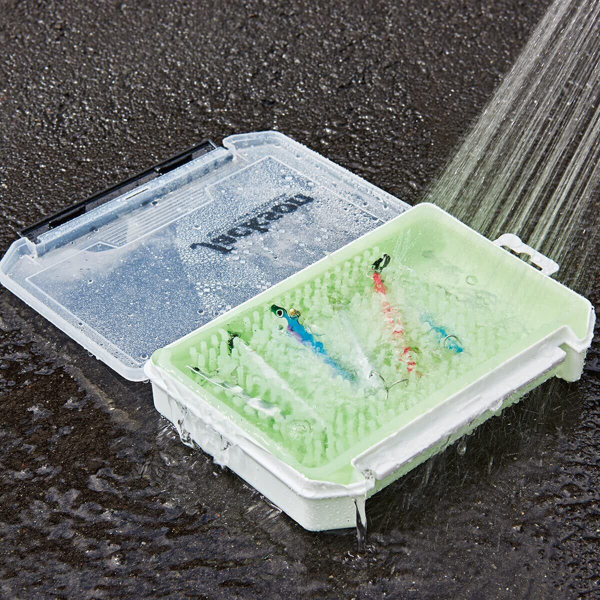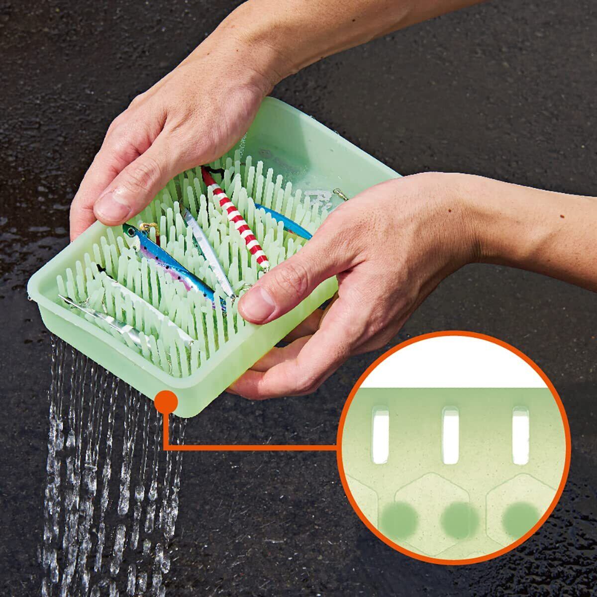 ジャクソン剣山 シリコン製万能ルアートレイ◆カラー:グロー/ブラックシリコンの突起がルアーどうしの絡まりを防止してくれてタックルからルアーを簡単に取り出せます。塗装の傷つき防止にも効果的です。また、ボックスに入れたまま塩抜きができ、傾けると水抜き穴から水を放出できます。あとはそのまま乾燥!!面倒なふき取り作業はいりません。