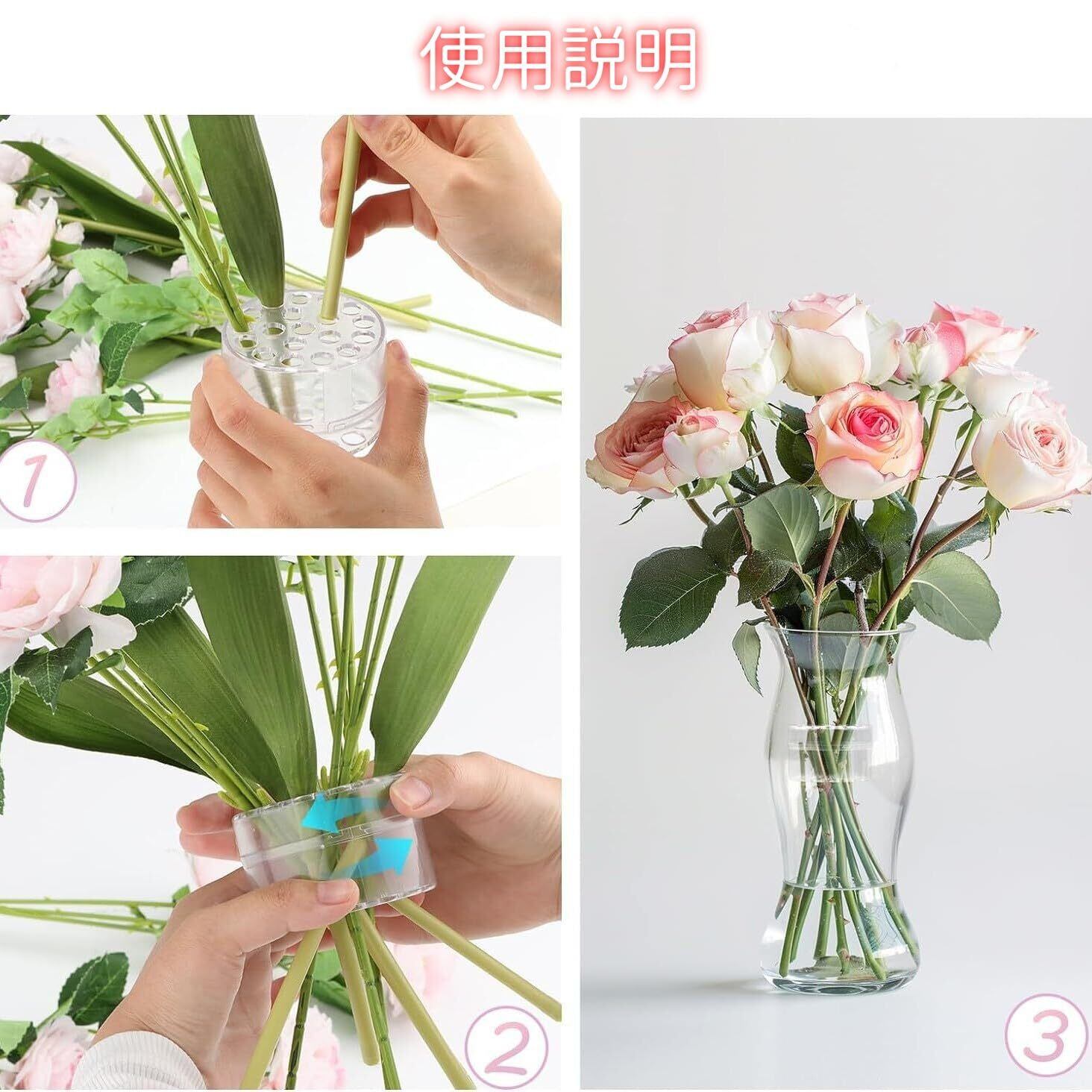 【使用方法】: 花の茎を剣山の穴に挿入し、穴ごとに1本ずつ挿入してから、花束を花瓶に入れるだけでいいです。