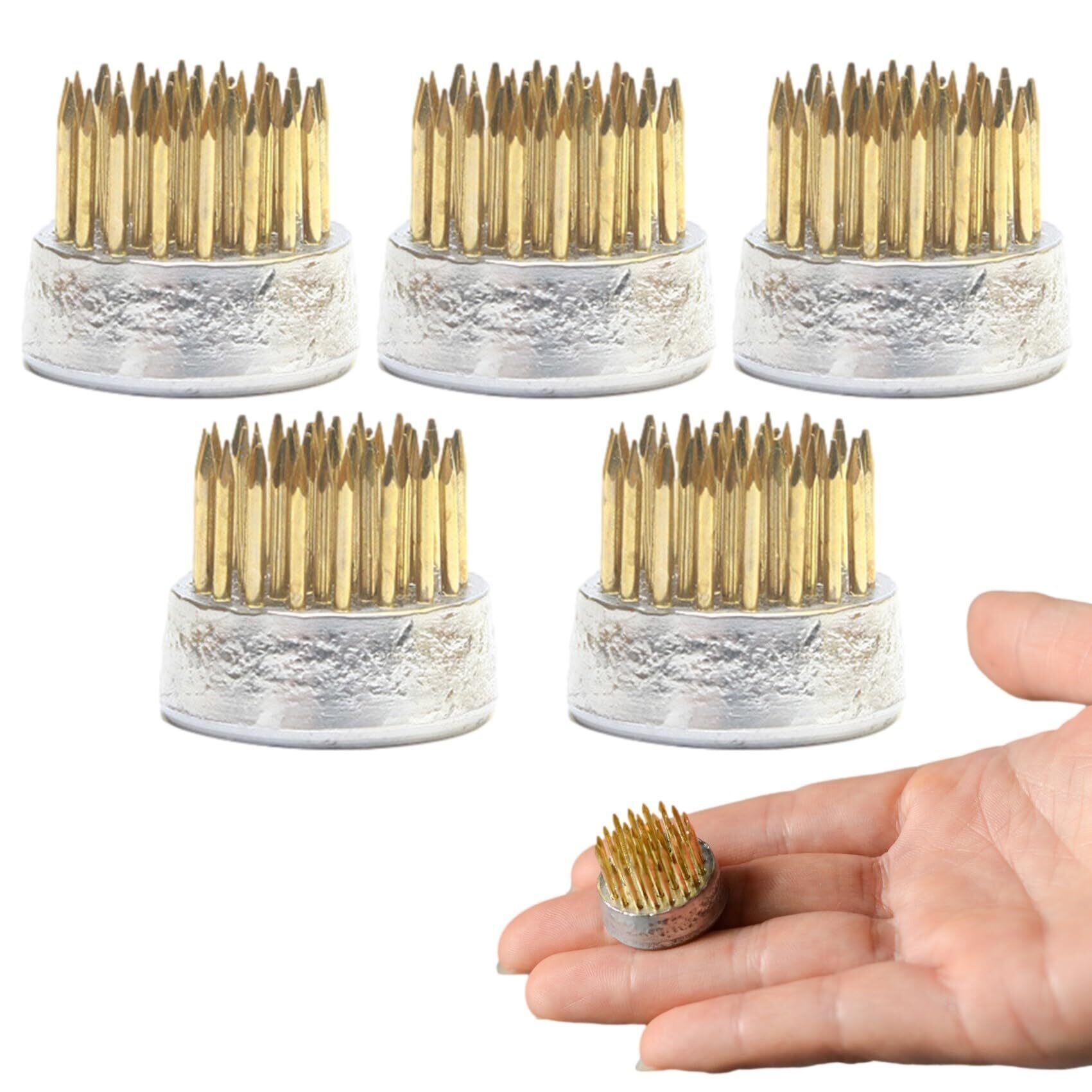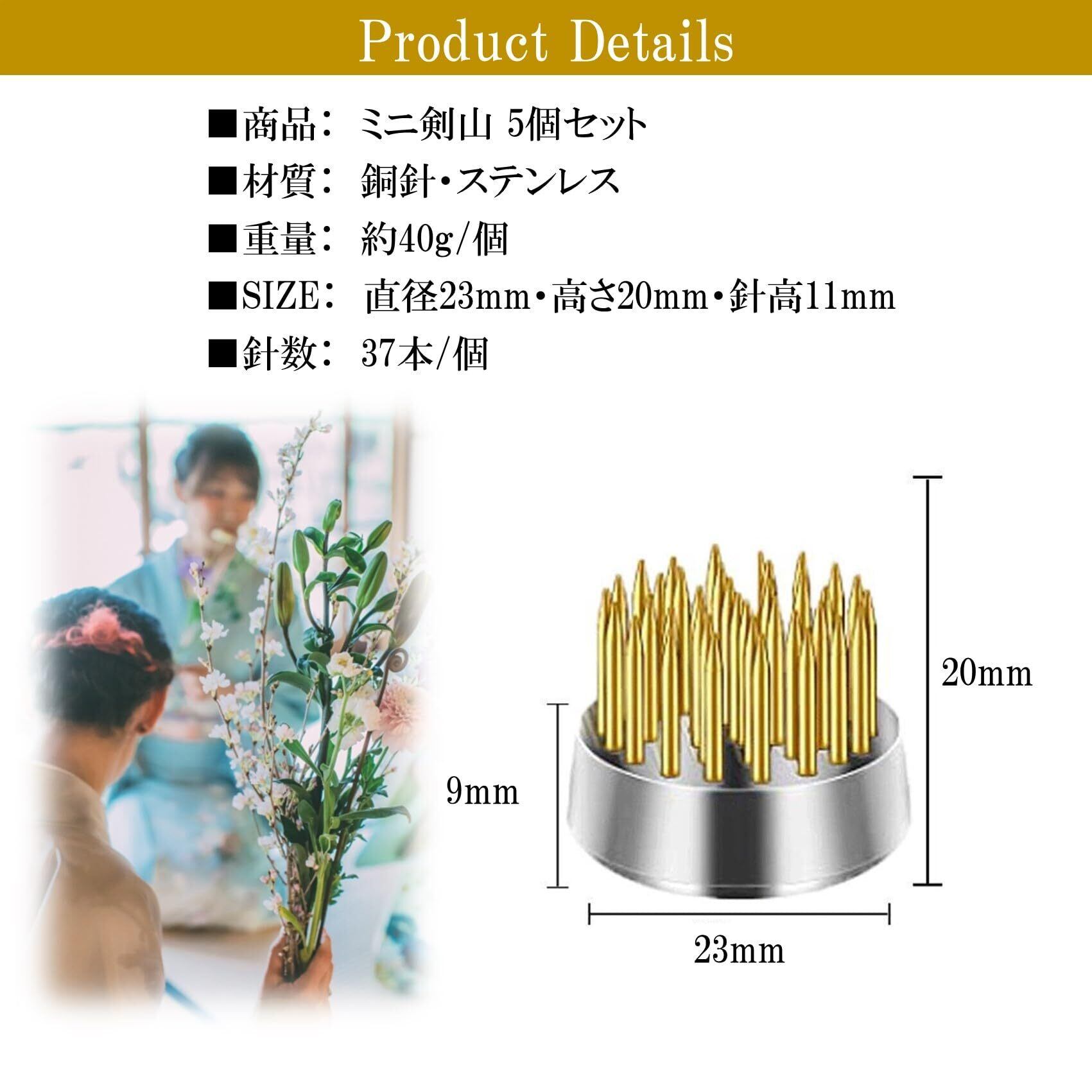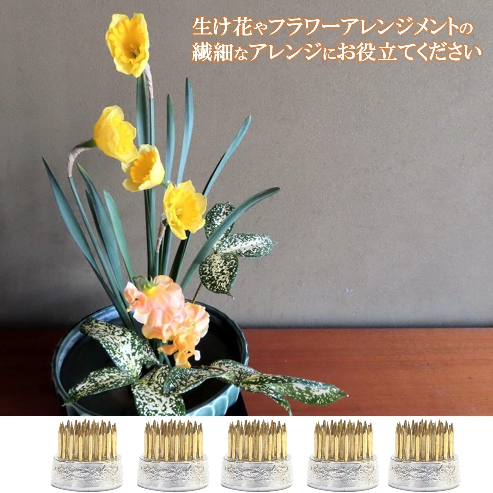商品詳細:ミニ剣山 5個セット 【材質】 銅針・ステンレス 【重量】 40g/個 【サイズ】 直径23mm・高さ20mm・針高11mm 【針数】 37本/個