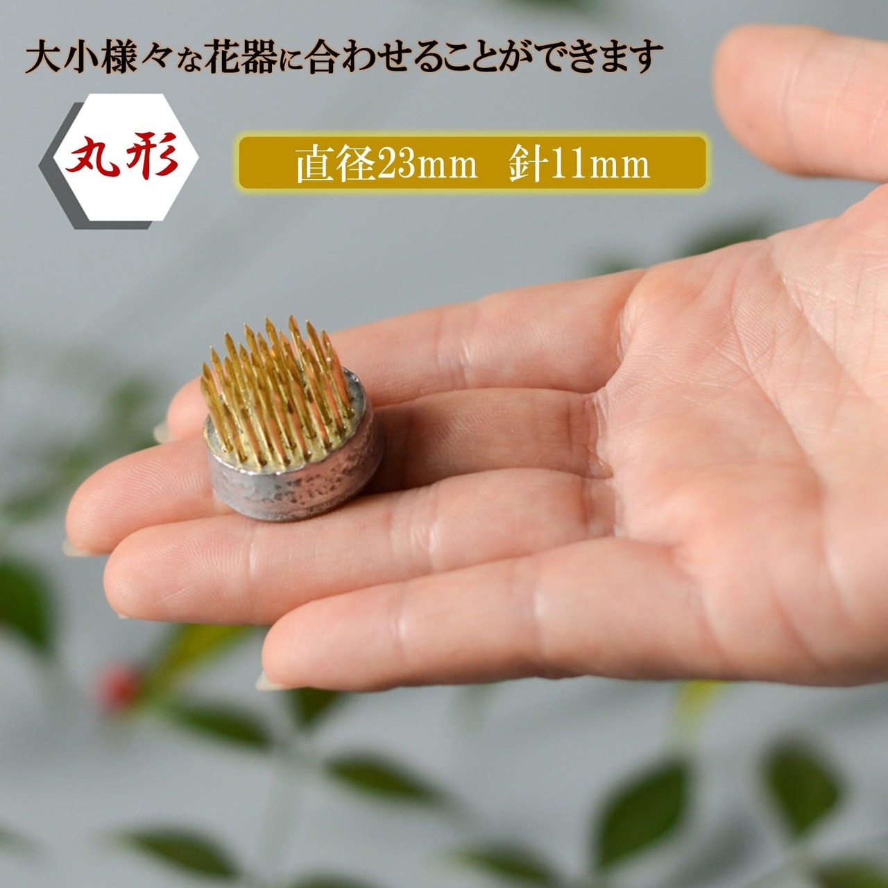 直径23mm丸形ミニ剣山は、大小様々なサイズや形状の花器に合わせることができます。花瓶や和陶磁器、グラスなど花器の選択肢が拡がります。