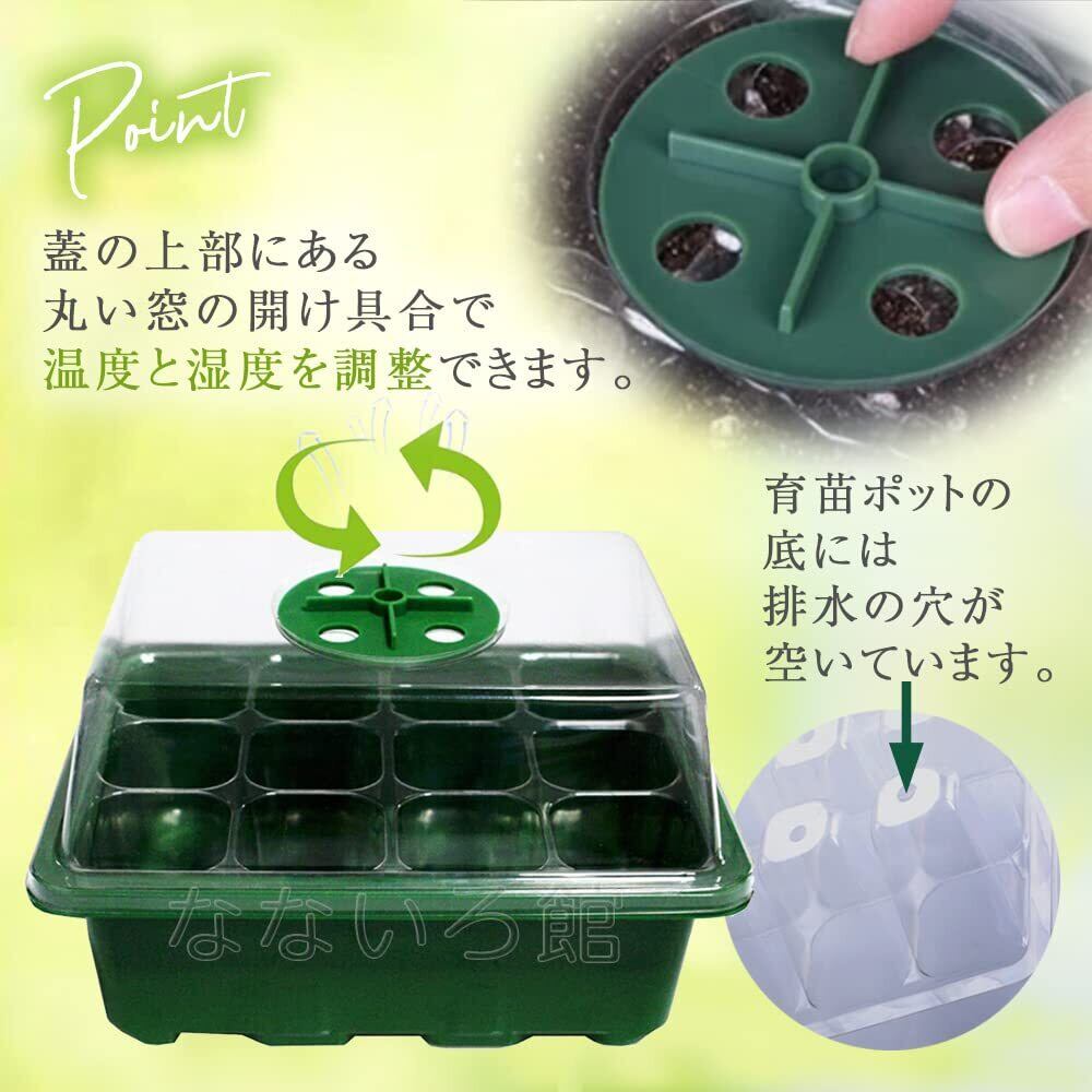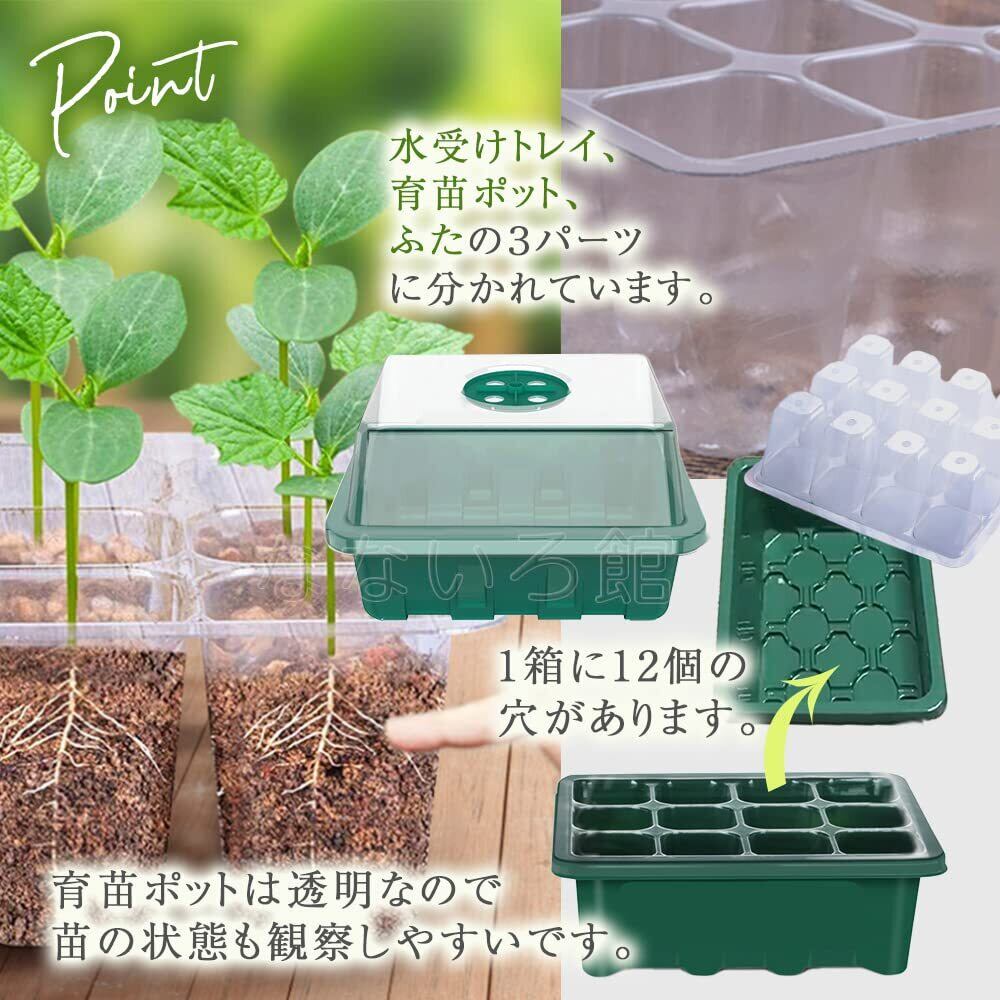 1箱に12個の穴があります。水受けトレイ、育苗ポット、ふたの3パーツ。