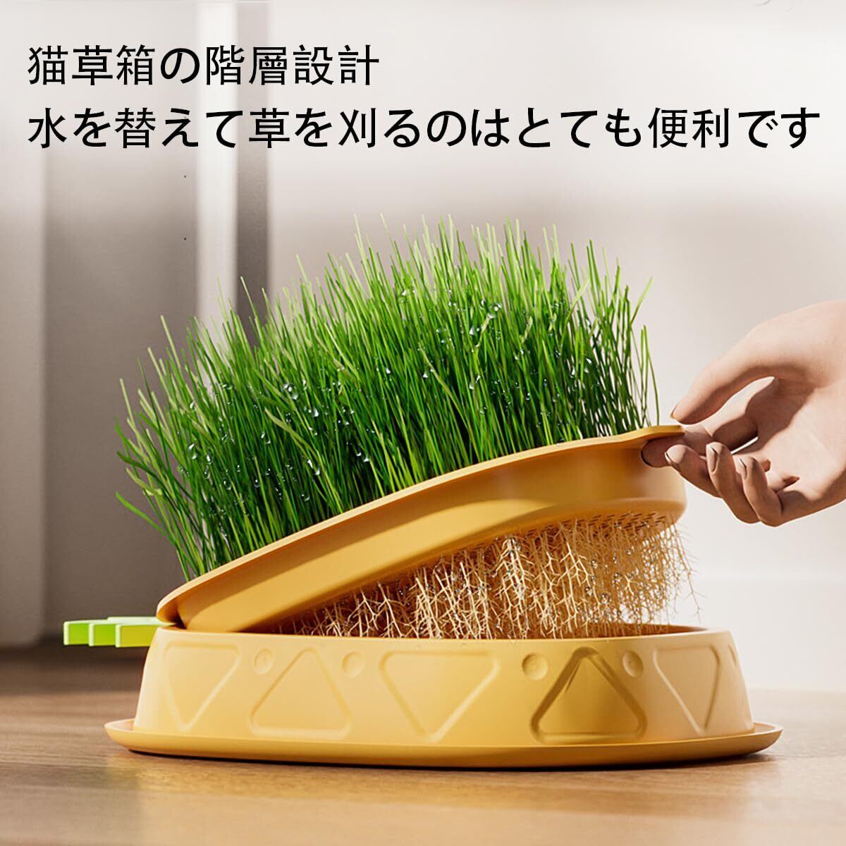 【栽培しやすい】:種子を水に6〜8時間浸す。メッシュトレイに種を均等に散らします。水が出水口から溢れるまでシャーシに水を注入します。注意:猫草が発芽した後、1-2日おきに水を交換し、4-7日だけで、成熟した猫草を収穫することができます。