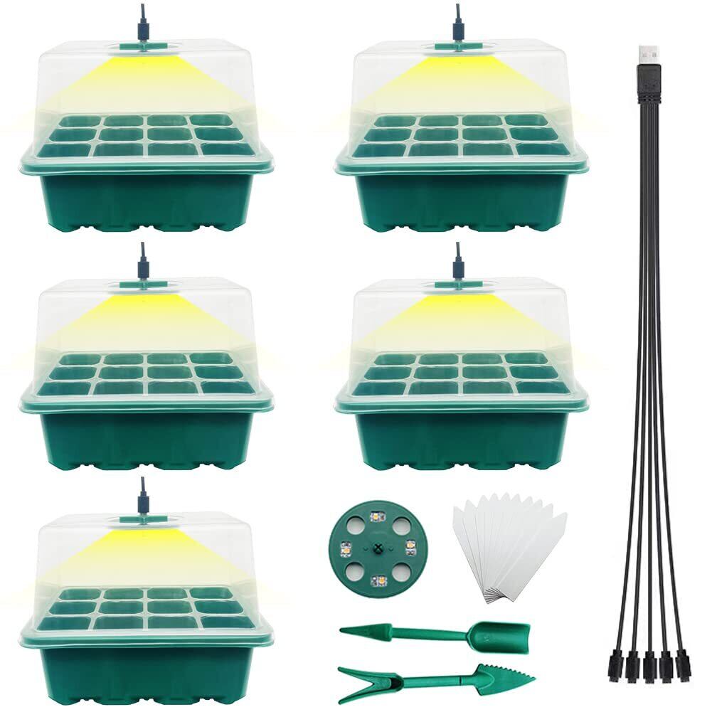 育苗ポット植物育成ライト付き 5個セット 育苗トレイ 育苗箱 12穴 高くする透明カバー 種子トレイ 発芽•育苗セット 種まきハウス 苗箱 種まき器 育苗ボックス 便利性 耐久性 通気性 野菜栽培 多肉植物 家庭菜園 園芸/植栽/庭園 プラグトレイ