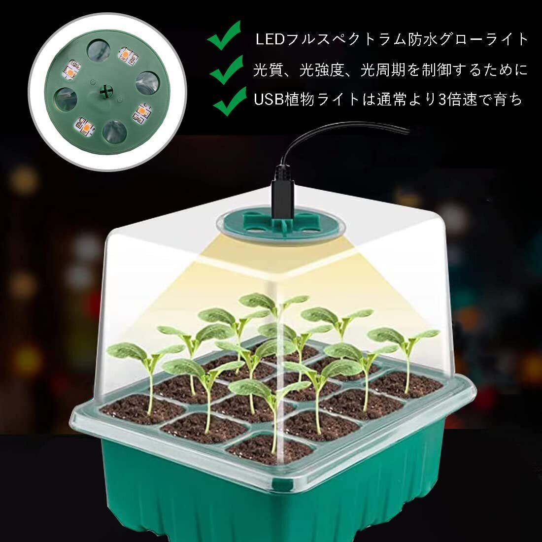 【植物育成ライト付き育苗箱】苗をより良く成長させるために、当社の育苗ポットには、4 つの LED フルスペクトル防水栽培ライトが付属しています。光質、光強度、光周期を制御するために、植物を常に最適な成長環境にし、迅速、自然成長、豊作を実現することができます。USB データケーブル長さ 1m、お客様がより便利に使用できるようにしました。