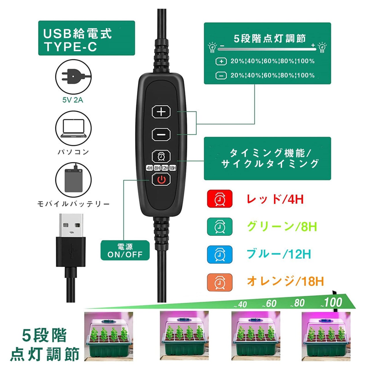 【スマートに調整可能なライトとタイマー】5段階の点灯調整がありますが、植物のいろんな成長温度に適合します。そして、タイミング機能が付いていますから夜になるとご安心ください。高品質のPETで作られた透明なプラスチックシェルは、高硬度、高靭性で作られた育苗トレーは、洗浄して再利用できます。
