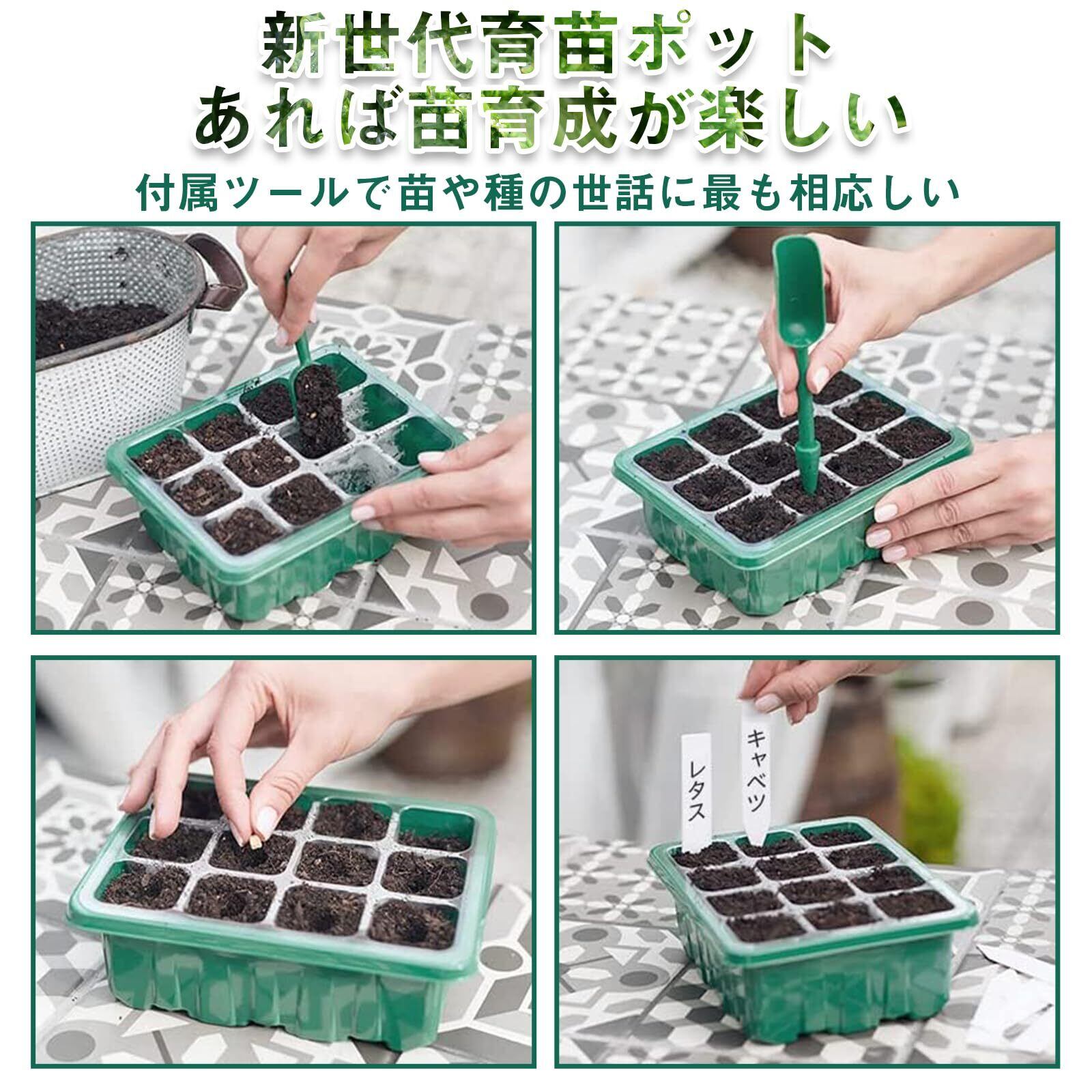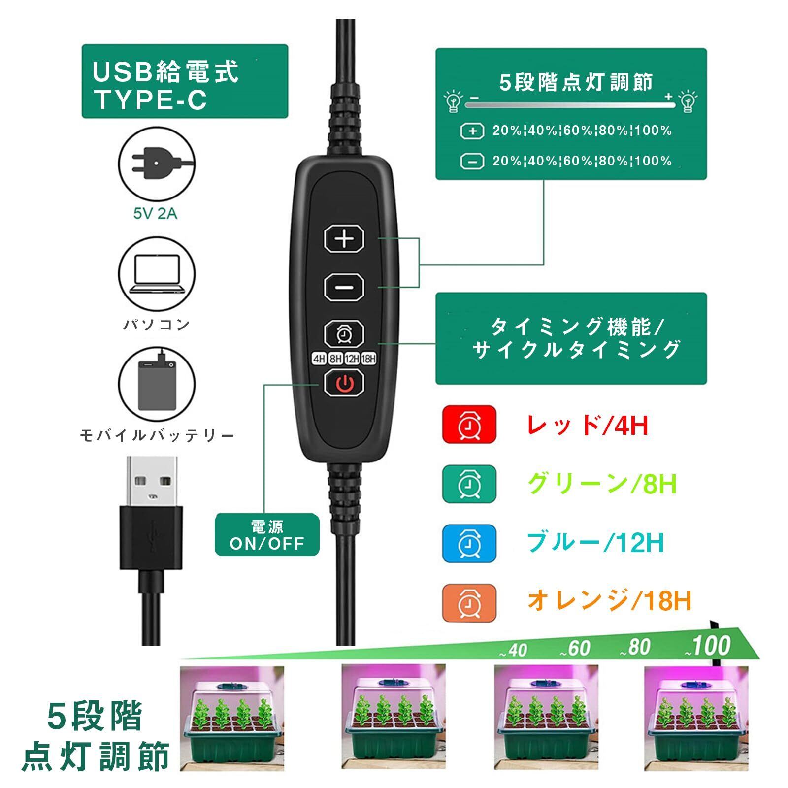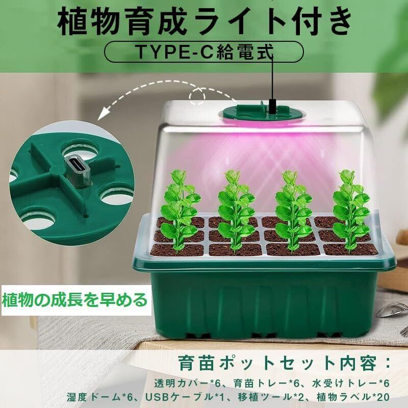 【新世代育苗ポット】セット内容:透明カバー*6、育苗トレー*6、水受けトレー*6、湿度ドーム*6、usbケーブル*1、移植ツール*2、植物ラベル*20。本体サイズ(1個):約18.5*14.5*16cmで、中には12穴があります。12穴で同時に12本の苗を育成できます。【野菜・草花・苗木の育苗に】ジャガイモ、トマト、ピーマン、ナス、花、ハーブ、その他の植物に最適です。家、農場、中庭、バルコニーに最適です。果物、野菜、花を植えるために使用できます。また、イチゴ、ブドウ、多肉植物、苗木などの栽培に適しています。